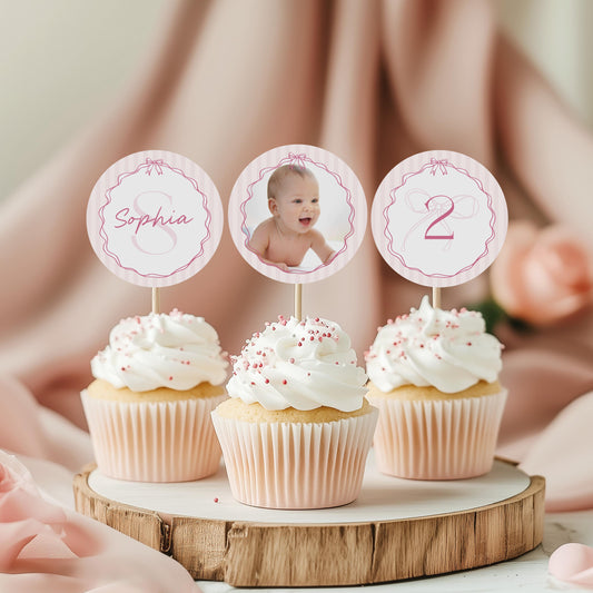 Pink Coquette Bow Birthday Party Cupcake Toppers Template