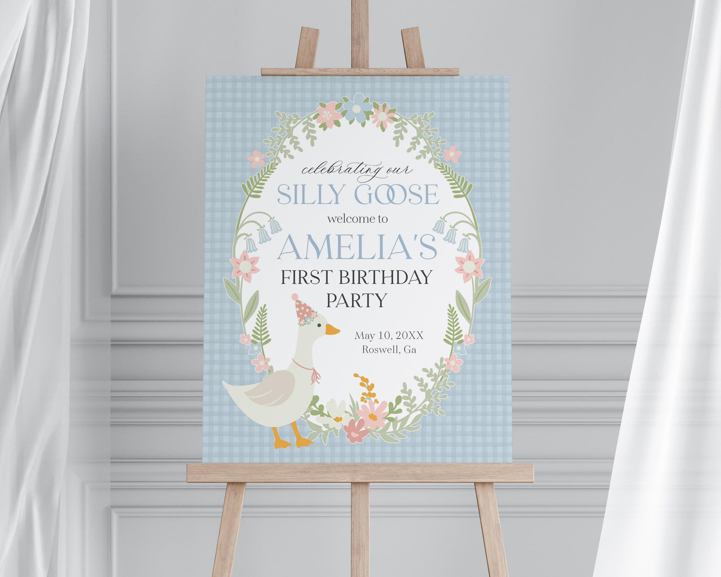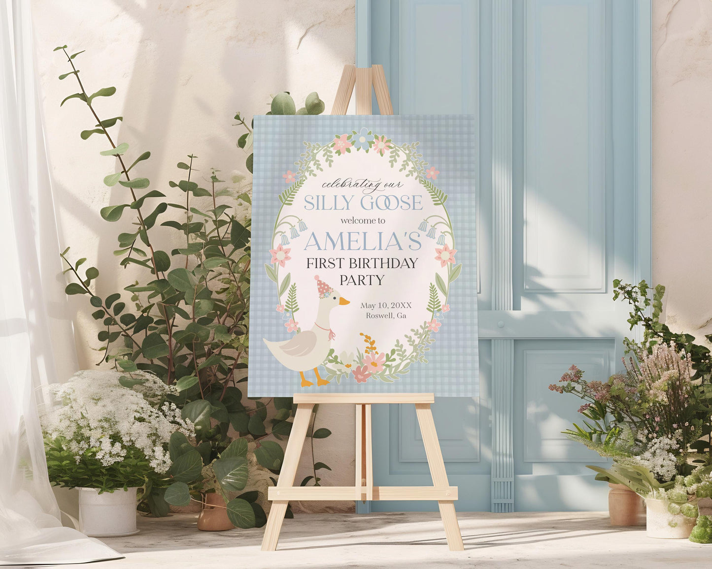 Blue Floral Silly Goose Birthday Welcome Sign Printable Template, Little Duck Theme Birthday Girl, Pastel Floral Gingham Birthday WP1023