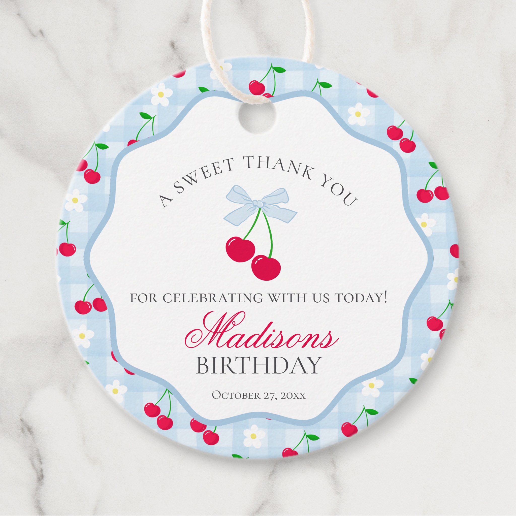 Blue Cherry Gingham Birthday Party Favor Tags Template