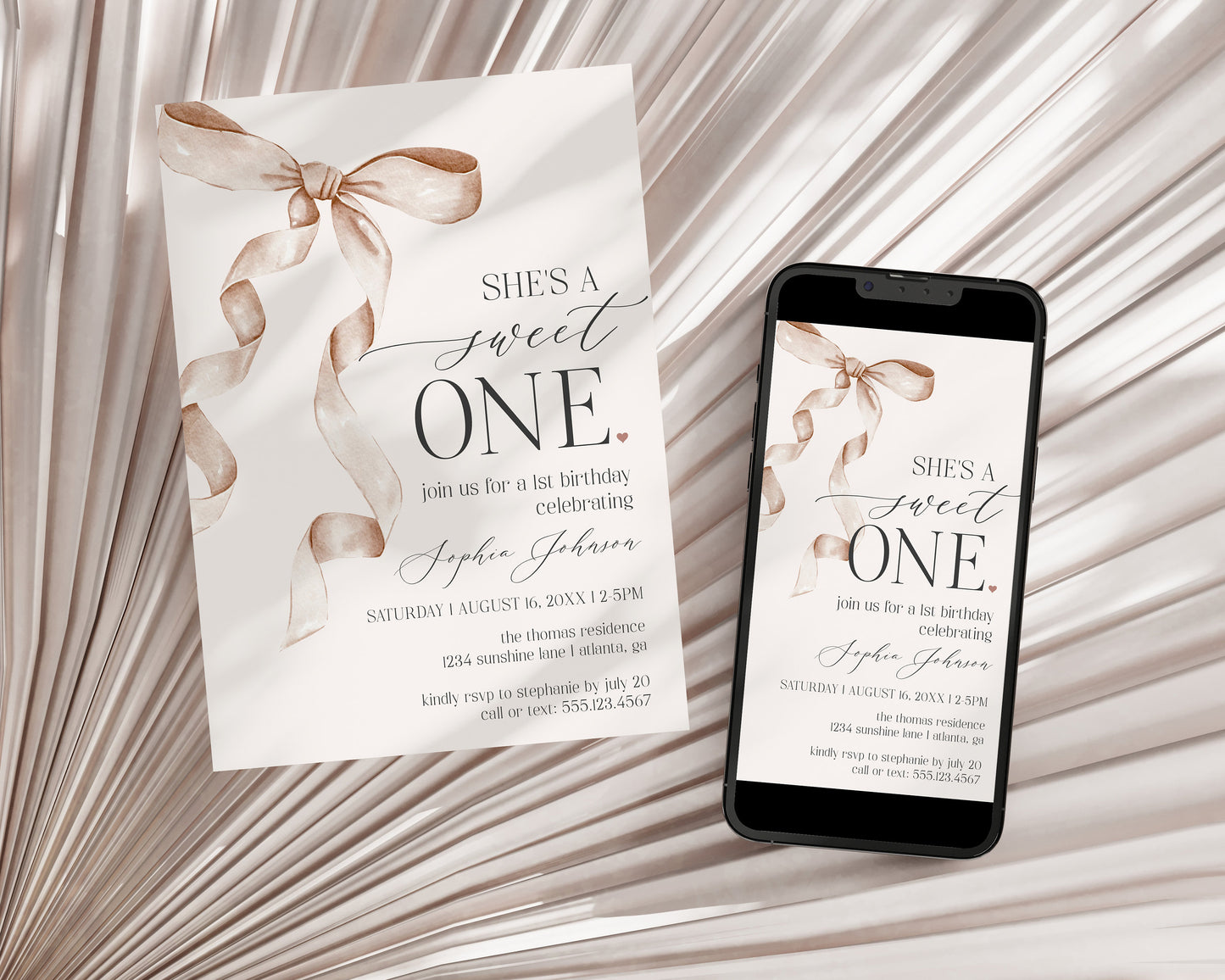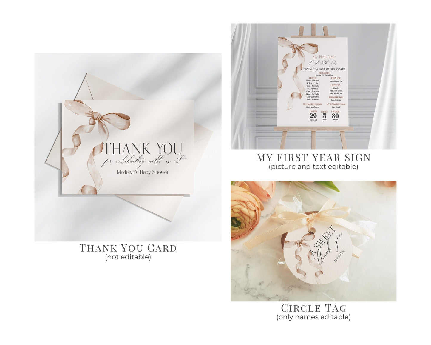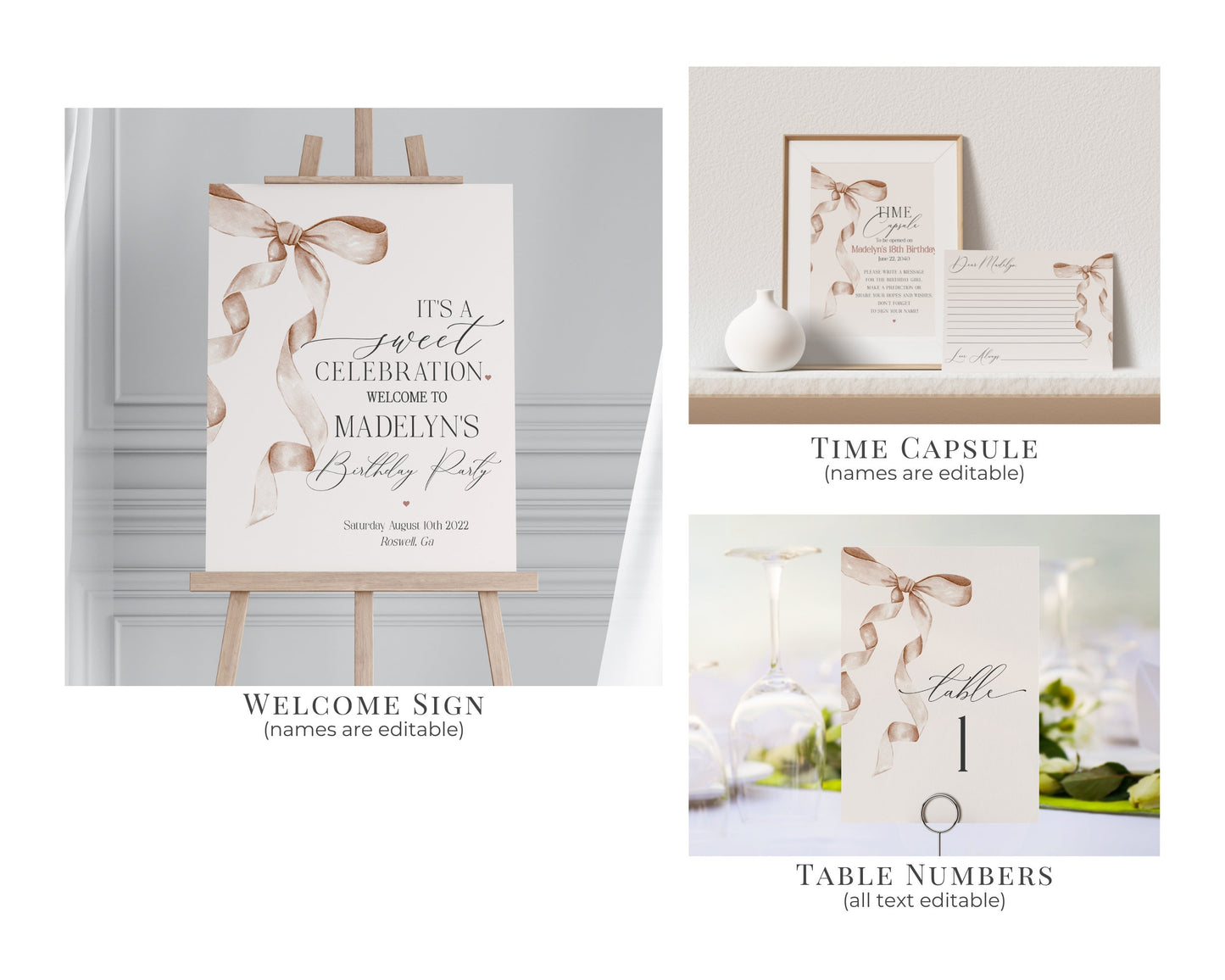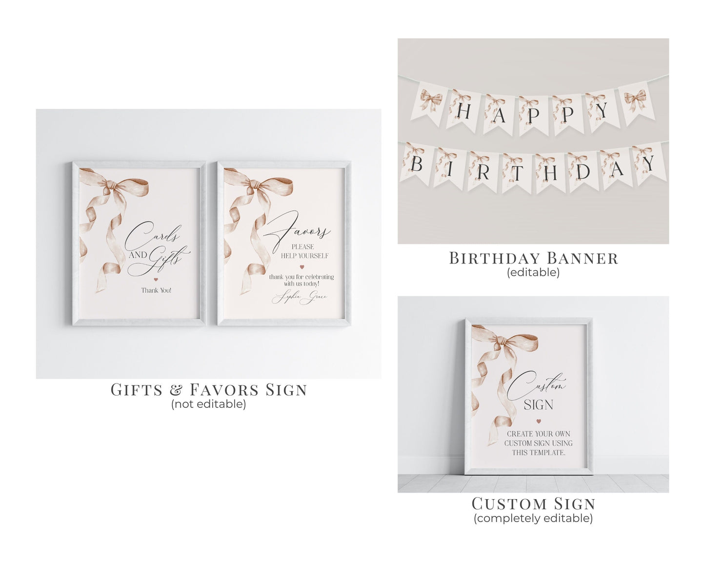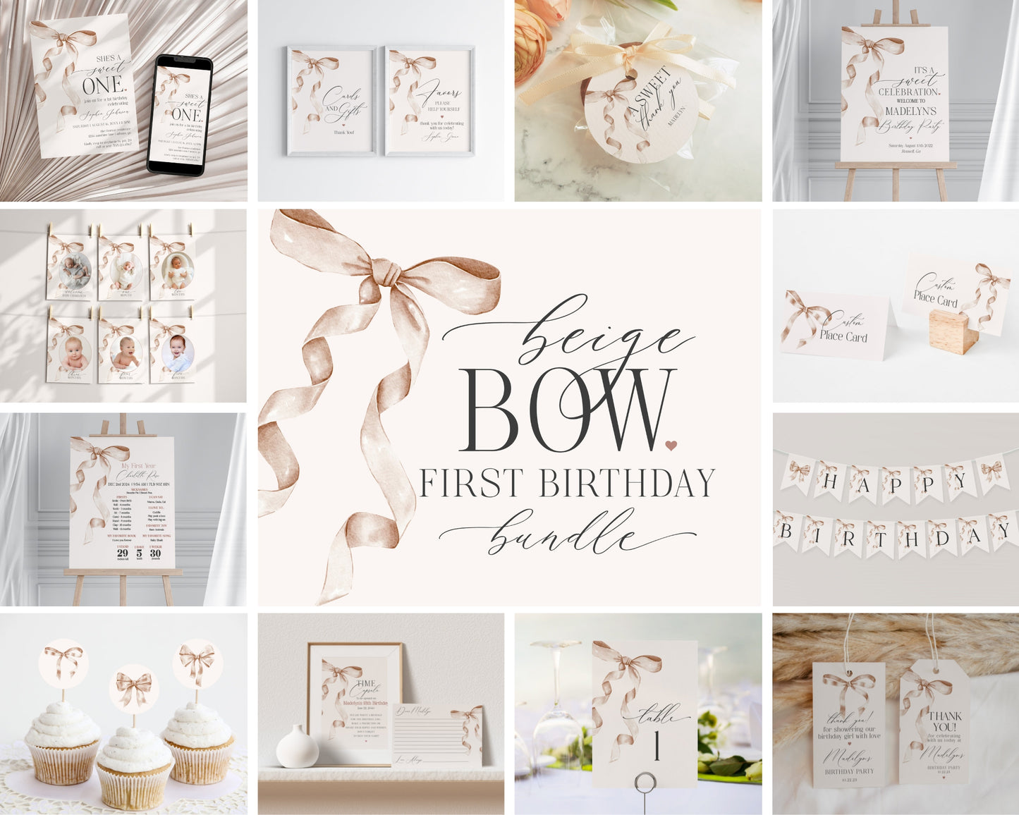 Elevate your first birthday party with this Coquette Beige Bow Party Decor! This timeless design adds a touch of elegance and charm to any event, featuring a beautifully crafted bow adorned with delicate gold and beige hues. This collection is sure to impress your guests and create lasting memories and perfect for adding some sophistication to your celebration. Our Classic neutral Bow Party Decor is a must-have for your party.