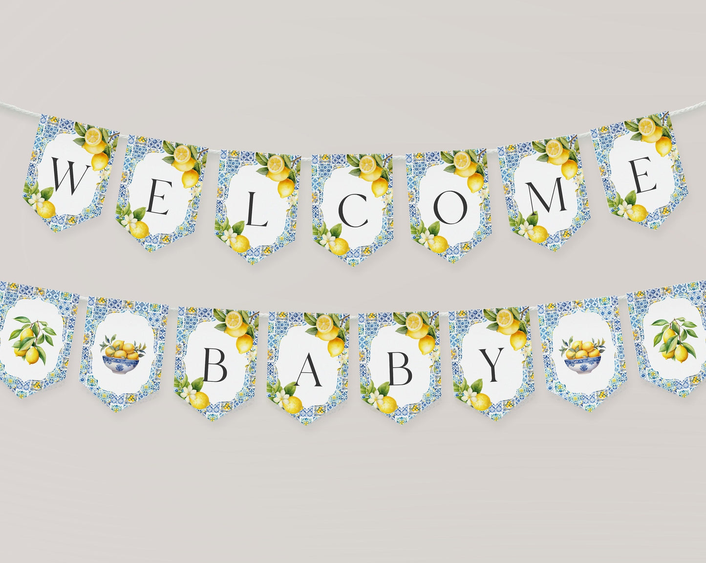 Amalfi Coast Baby Shower Banner Printable Template, Lemon Citrus Mediterranean shower decor with blue tiles Italian theme tuscan beach party
