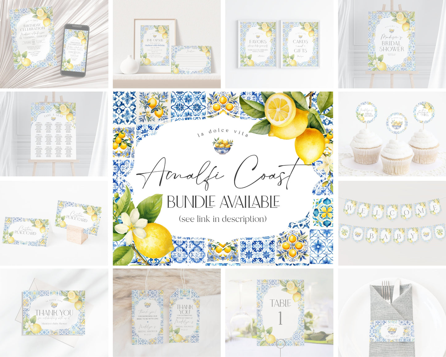 Amalfi Coast Bridal Shower Printable Bundle, Lemon Citrus Mediterranean shower decor with blue tile, Coastal Italian tuscan beach party