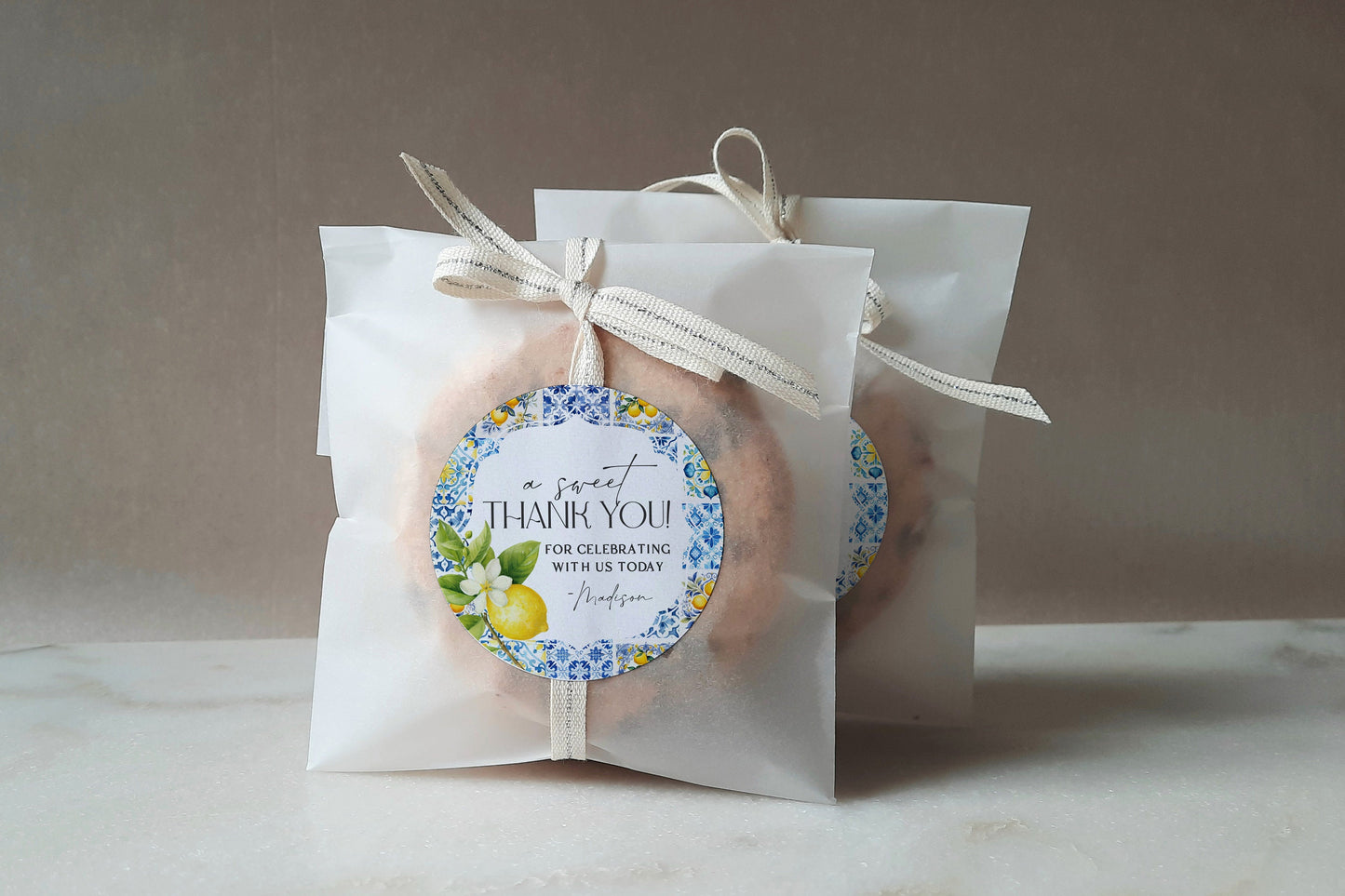 Amalfi Coast Bridal Shower Circle Favor Tags Printable Template, Lemon Citrus Mediterranean shower decor with blue tiles Italian theme party