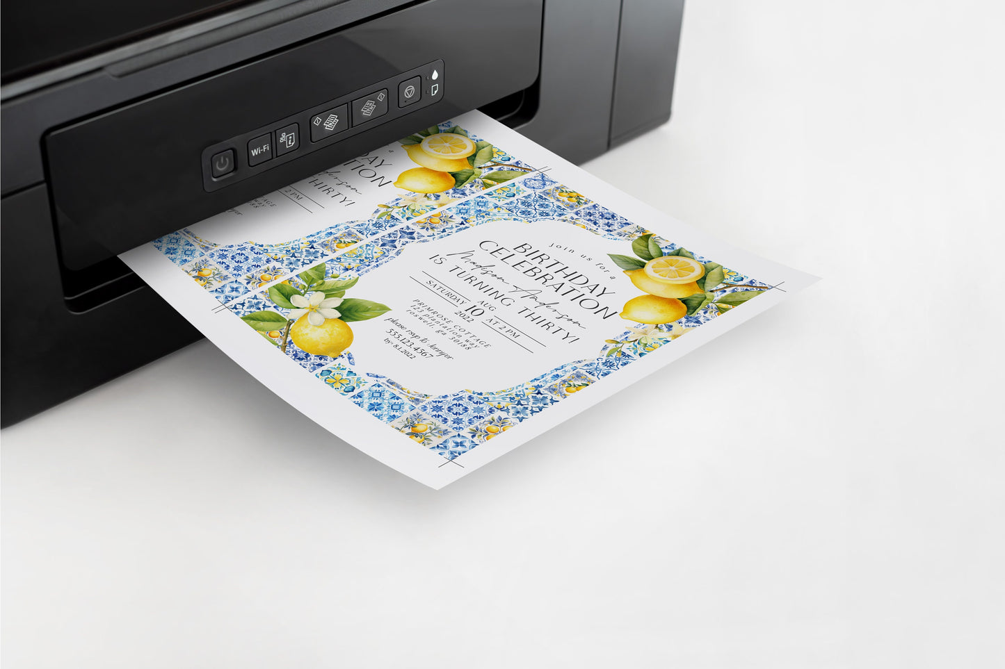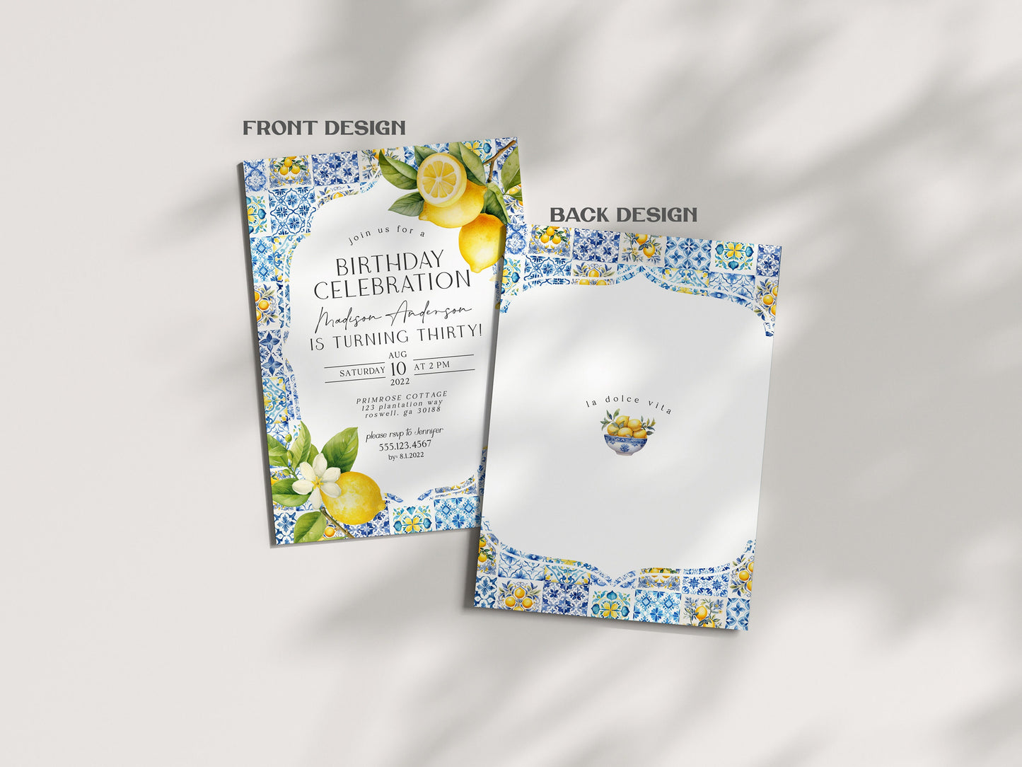Amalfi Coast Birthday Invitation Printable Template, Citrus Mediterranean bday decor with blue tiles, Italian coastal theme tuscan party