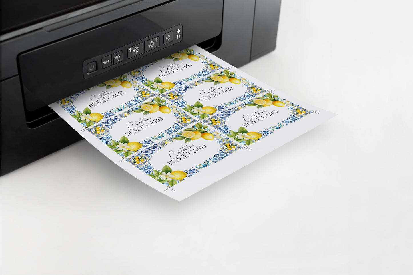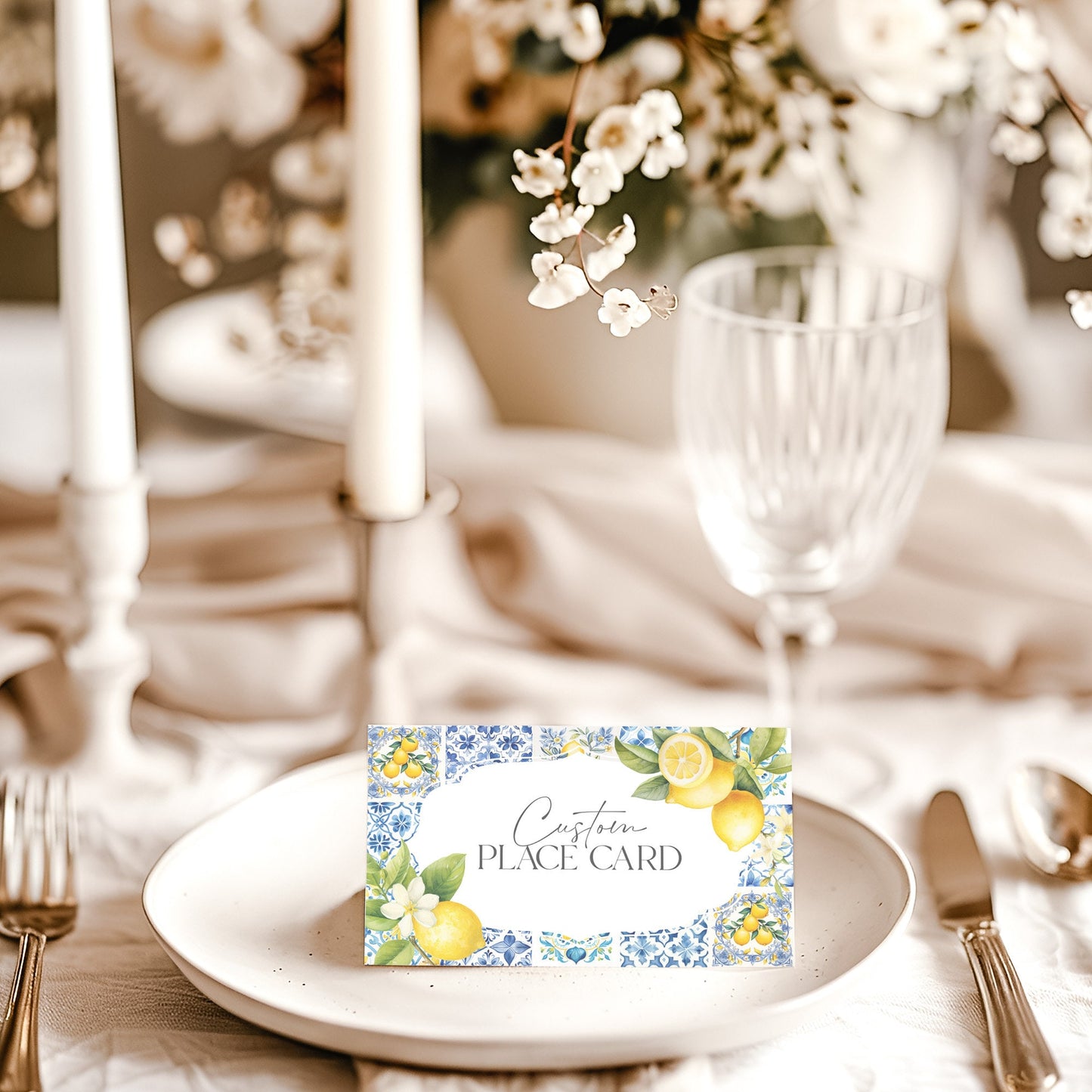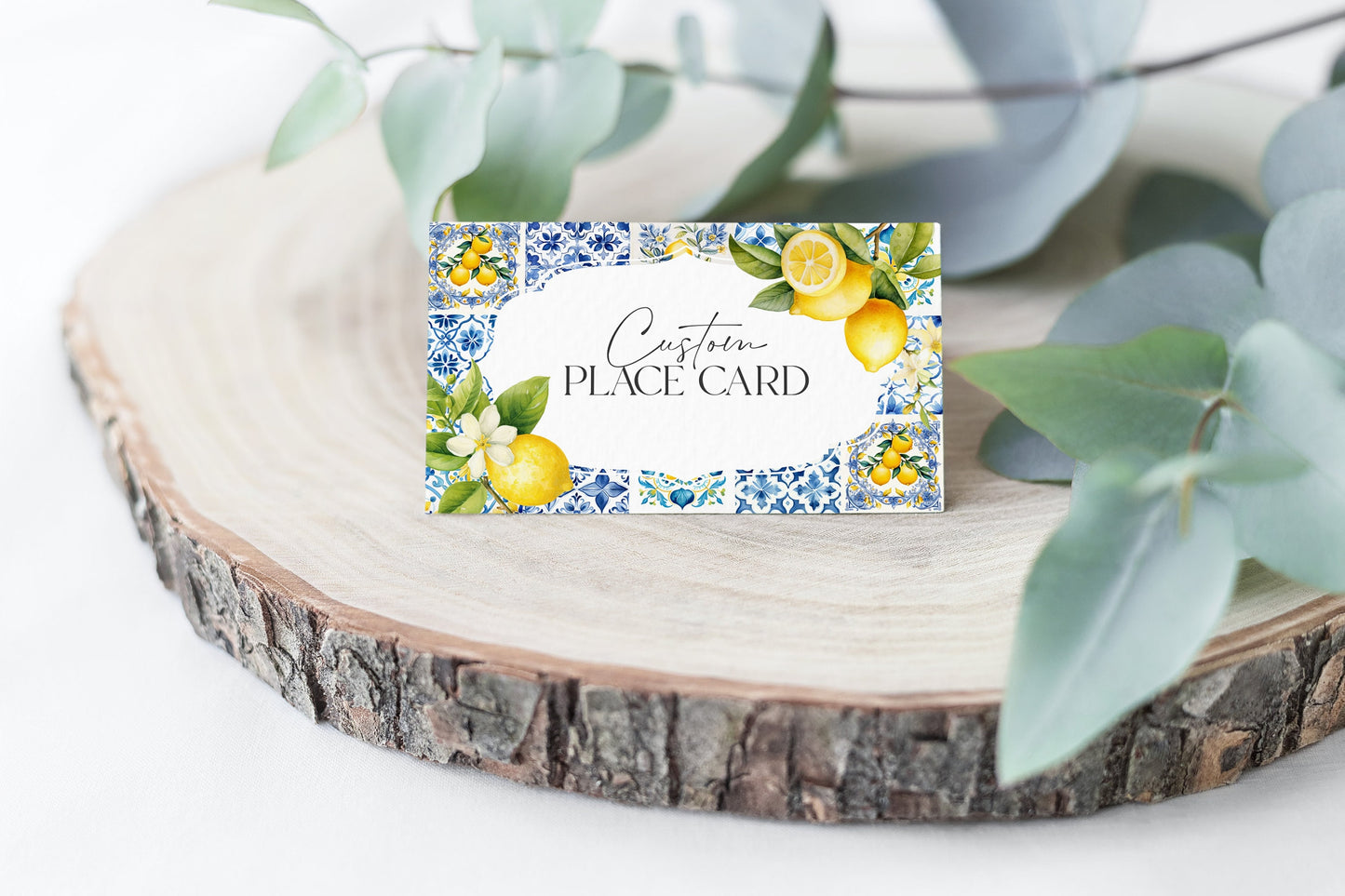 Amalfi Coast Place Cards for Baby or Bridal Shower or Birthday Printable Template, Lemon Citrus Mediterranean shower decor with blue tiles