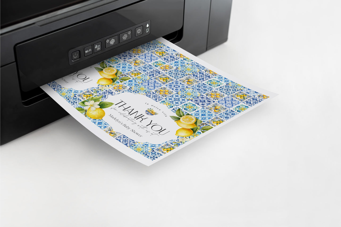 Amalfi Coast Thank You Card Printable Template, Lemon Citrus Mediterranean decor with blue tiles, Coastal Italian theme tuscan beach party