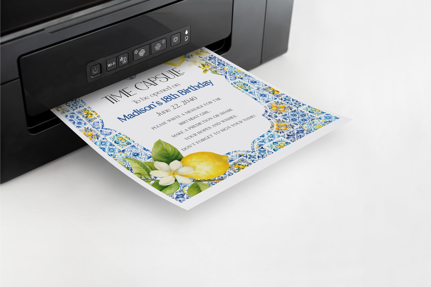 Amalfi Coast Time Capsule Printable Template, Citrus Mediterranean bday decor with blue tiles, Coastal Italian theme tuscan beach party