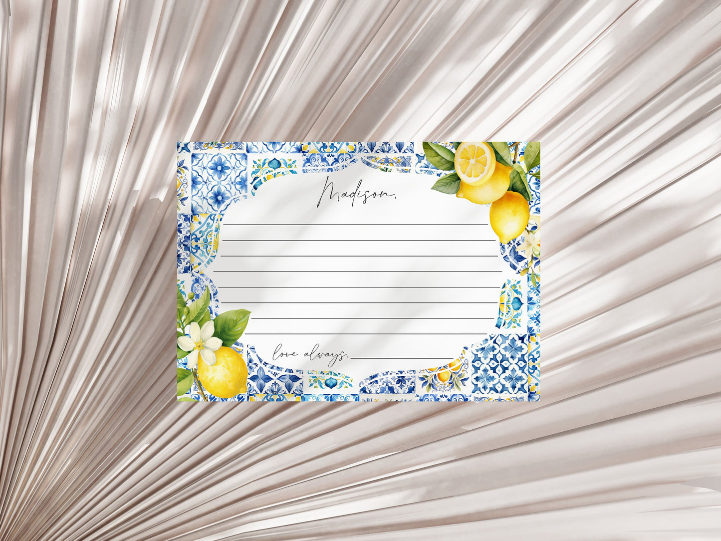 Amalfi Coast Recipe Card Printable Template for Bridal Shower, Lemon Citrus Mediterranean shower decor with blue tiles, Italian Tuscan theme