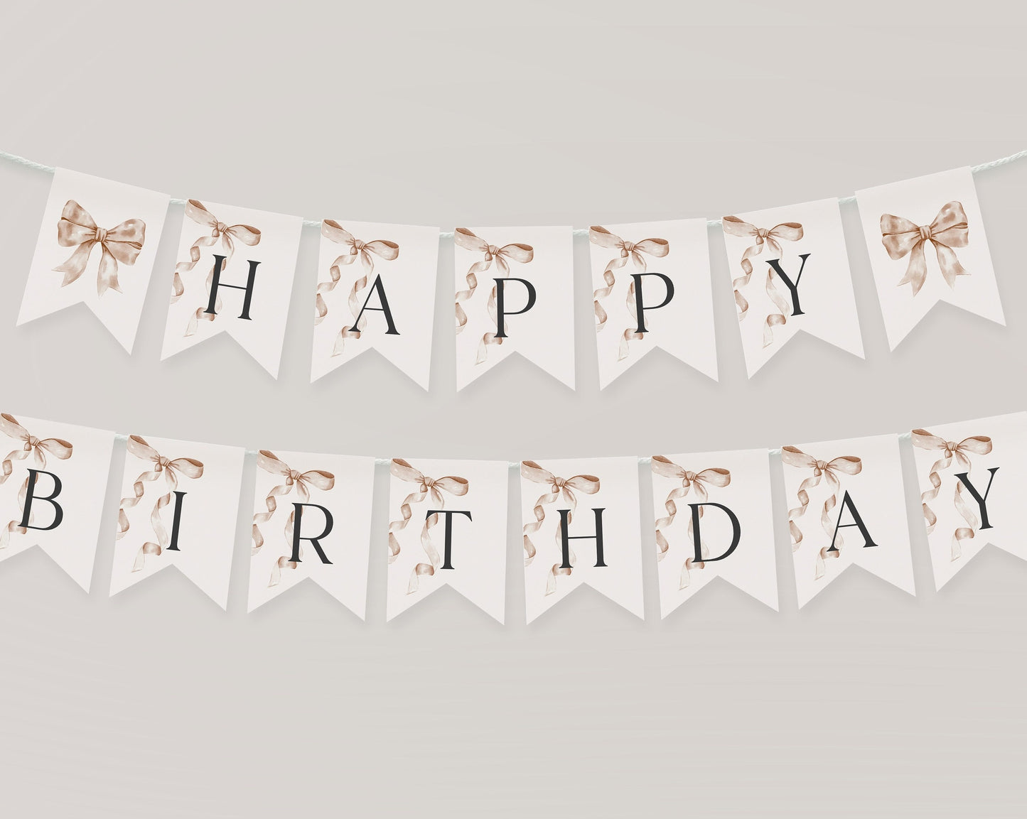 Beige Bow Birthday Banner Printable Template, Neutral preppy coquette bow theme party for fancy southern girl, grandmillenial bow decor
