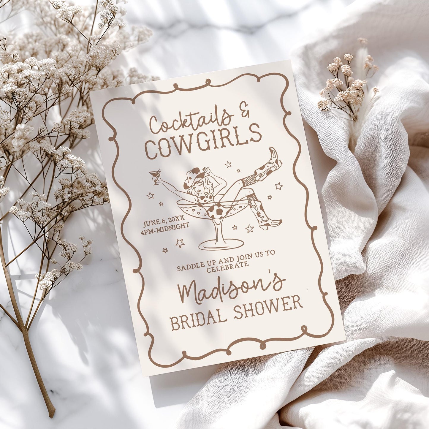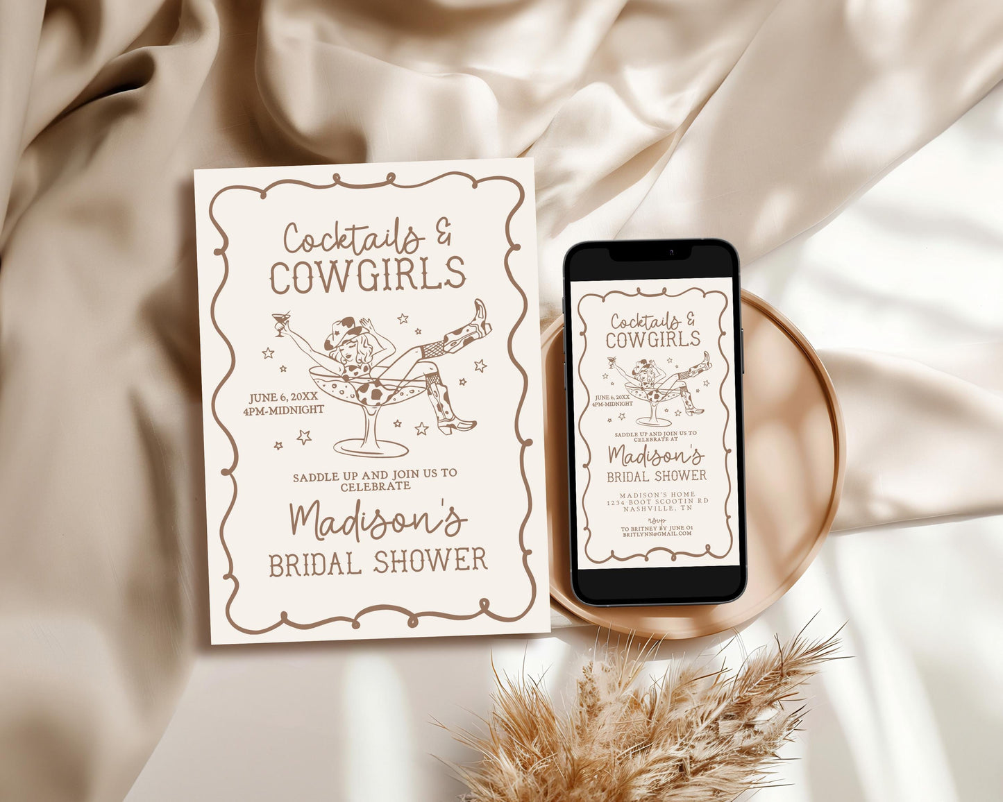 Beige Cocktails and Cowgirls Bridal Shower Invitation Template