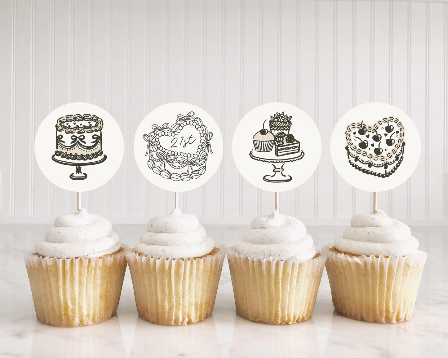 Beige Coquette Heart Cake Galentines Party Cupcake Toppers Template