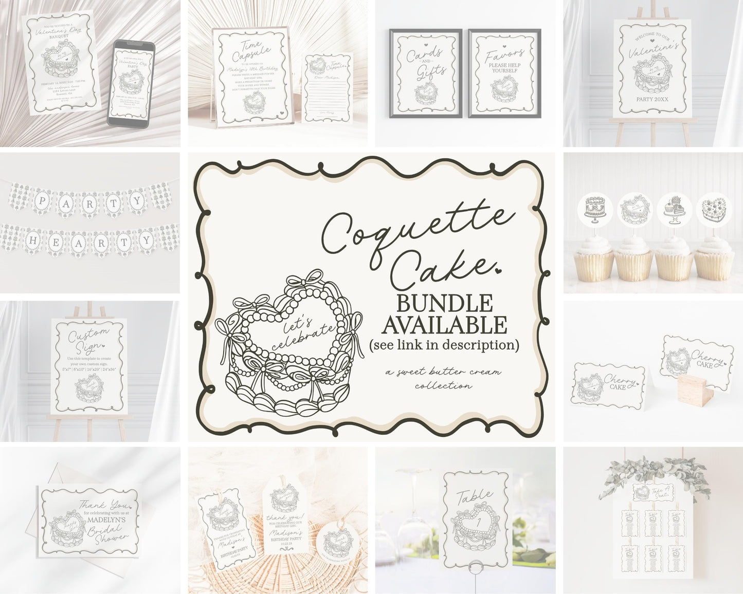 Beige Retro Coquette Heart Cake Valentines Party Bundle Template