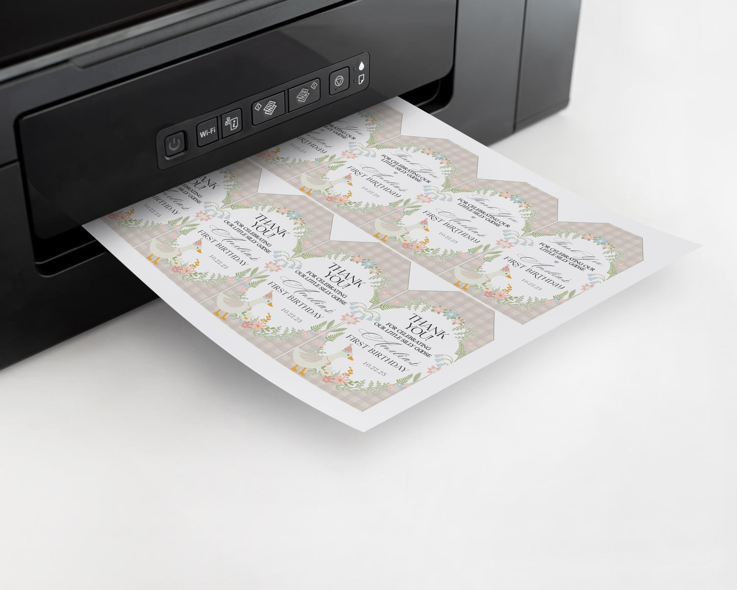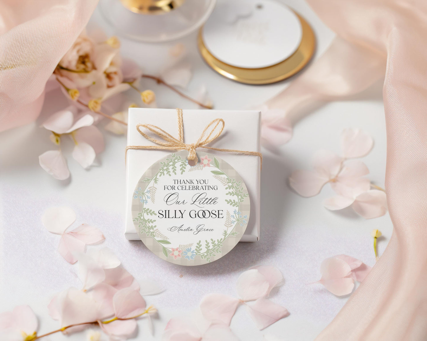 Beige Floral Silly Goose Birthday Favor Tags Printable Template, Little Duck Theme Birthday Girl, Pastel Gingham Birthday Party Decor WP1025