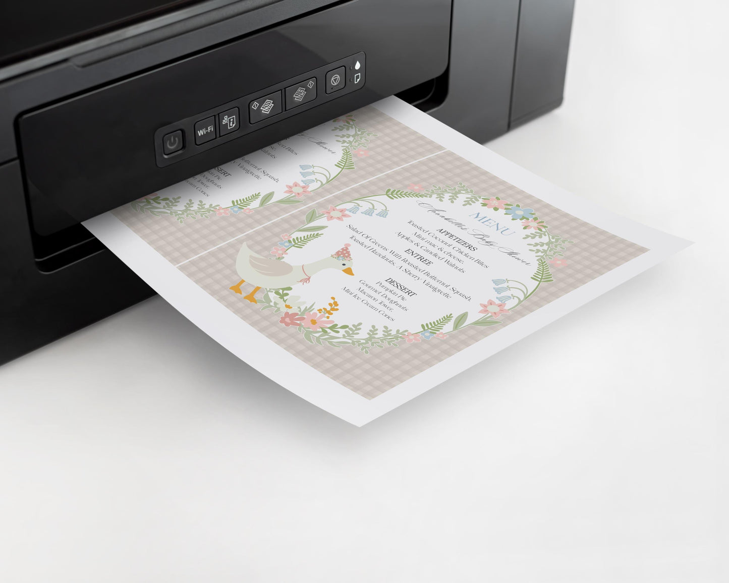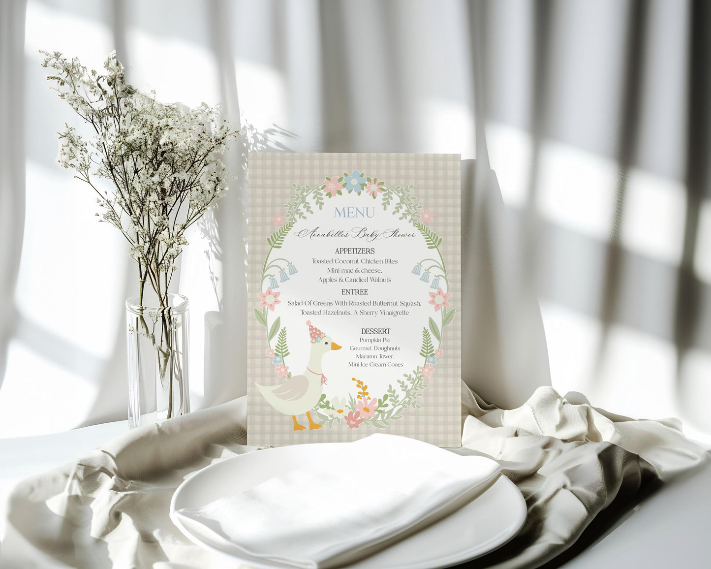 Beige Floral Silly Goose Printable Menu Template, Little Duck Theme Girl Birthday, Pastel Gingham Baby Shower Sprinkle WP1025