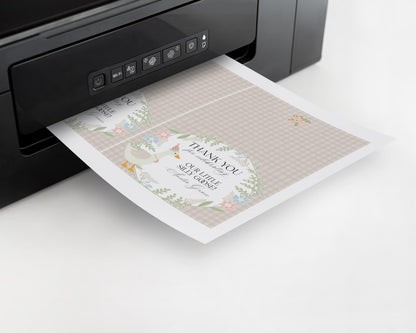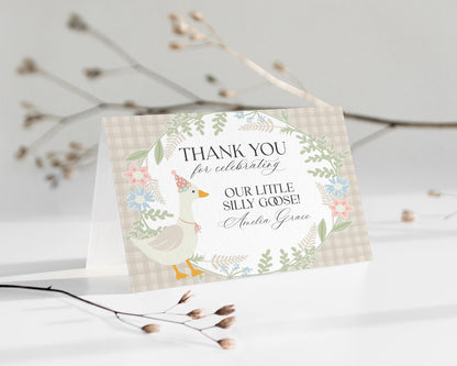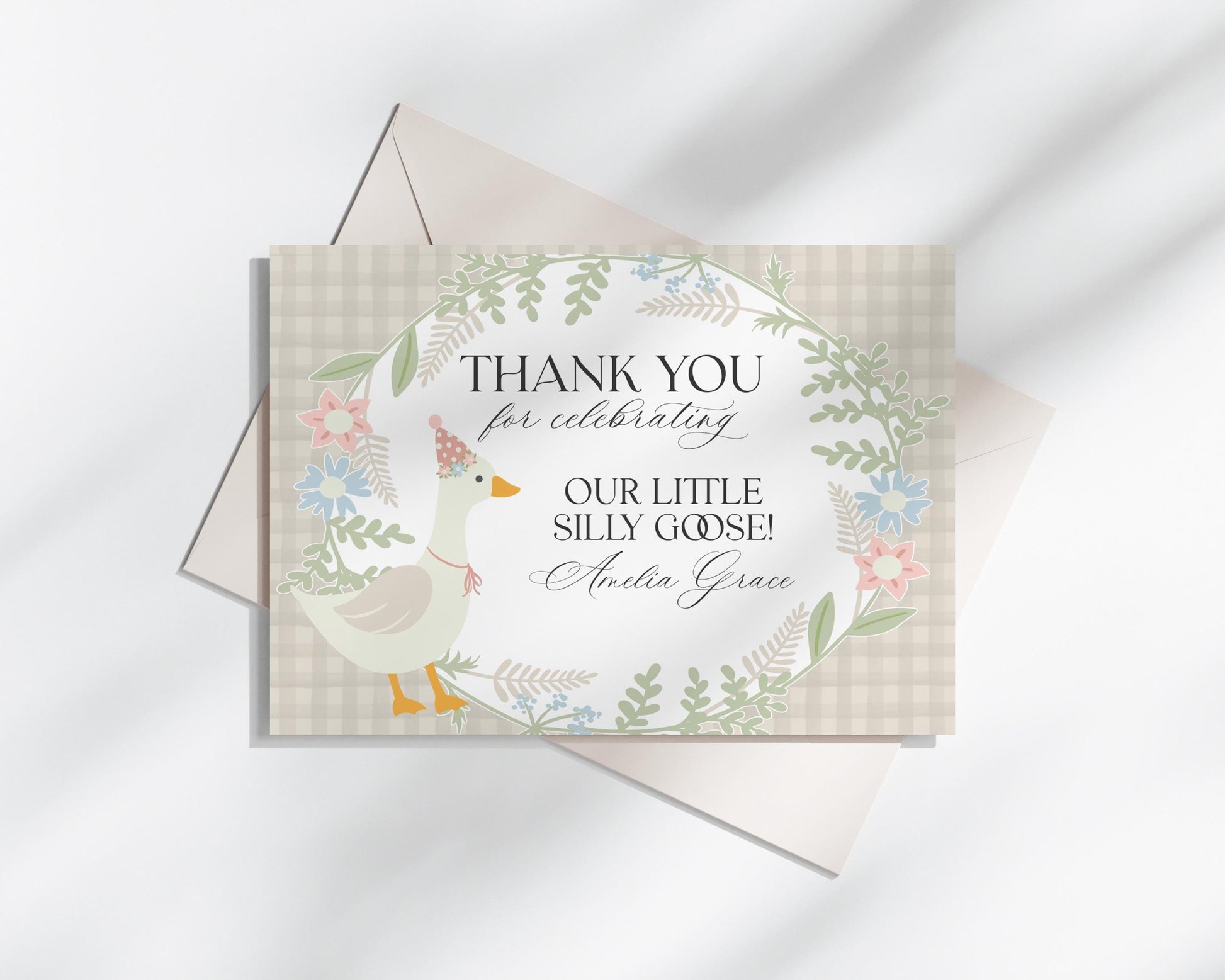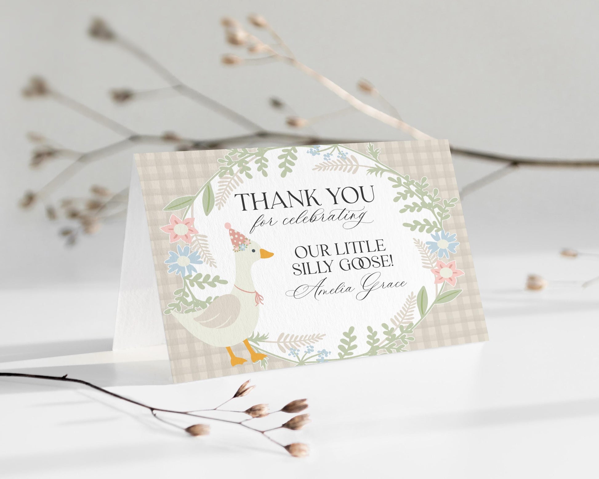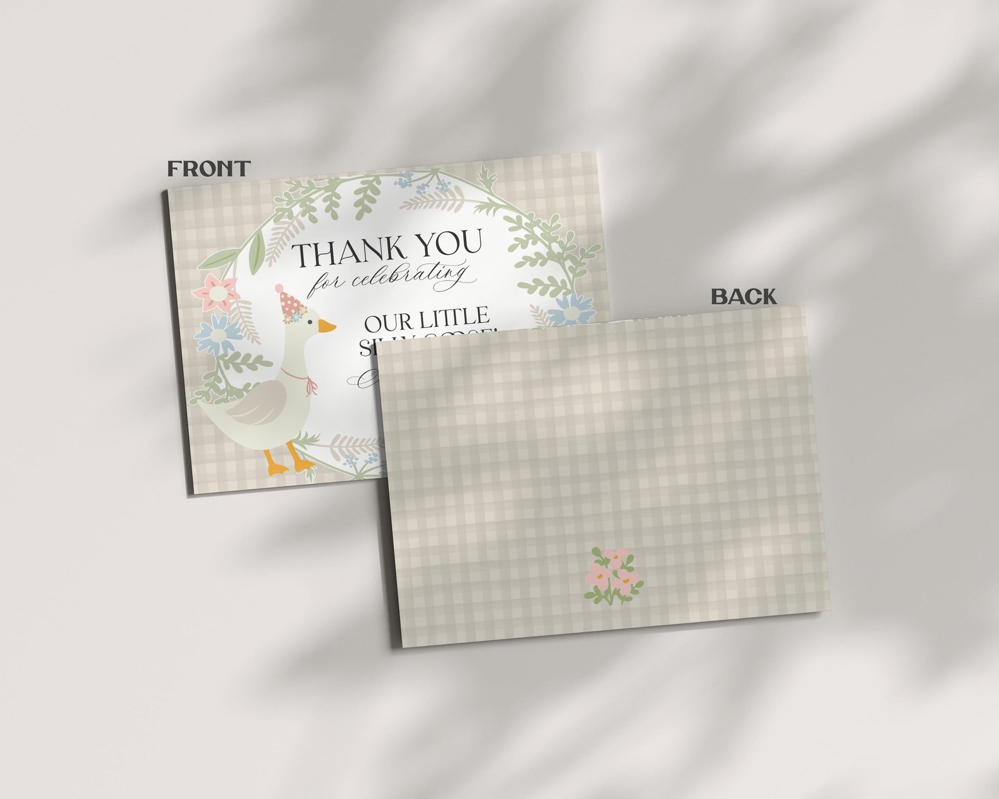 Beige Floral Silly Goose Thank You Card Printable Template, Little Duck Girl Birthday Party, Pastel Gingham Baby Shower Sprinkle WP1025