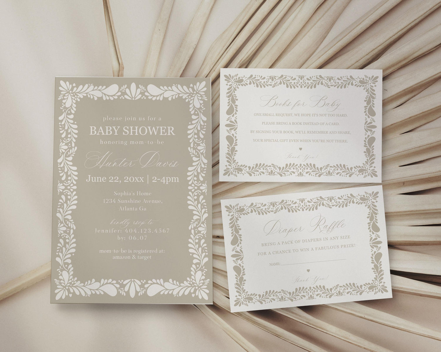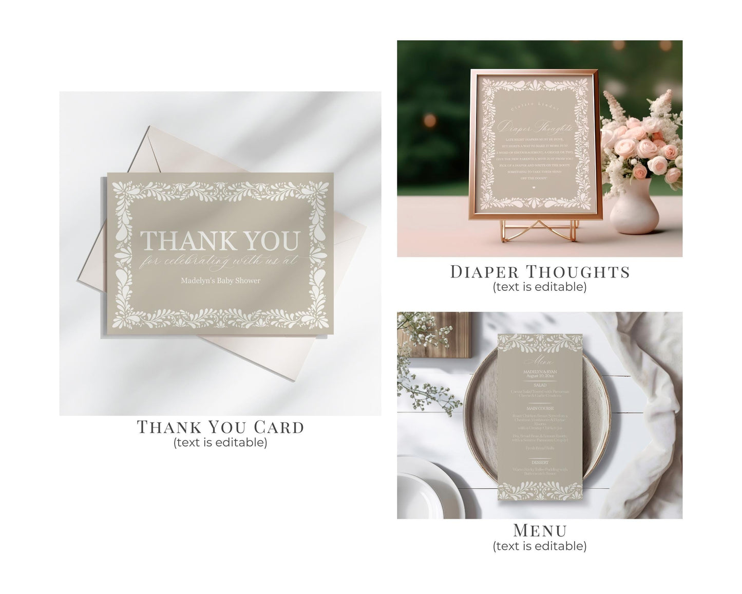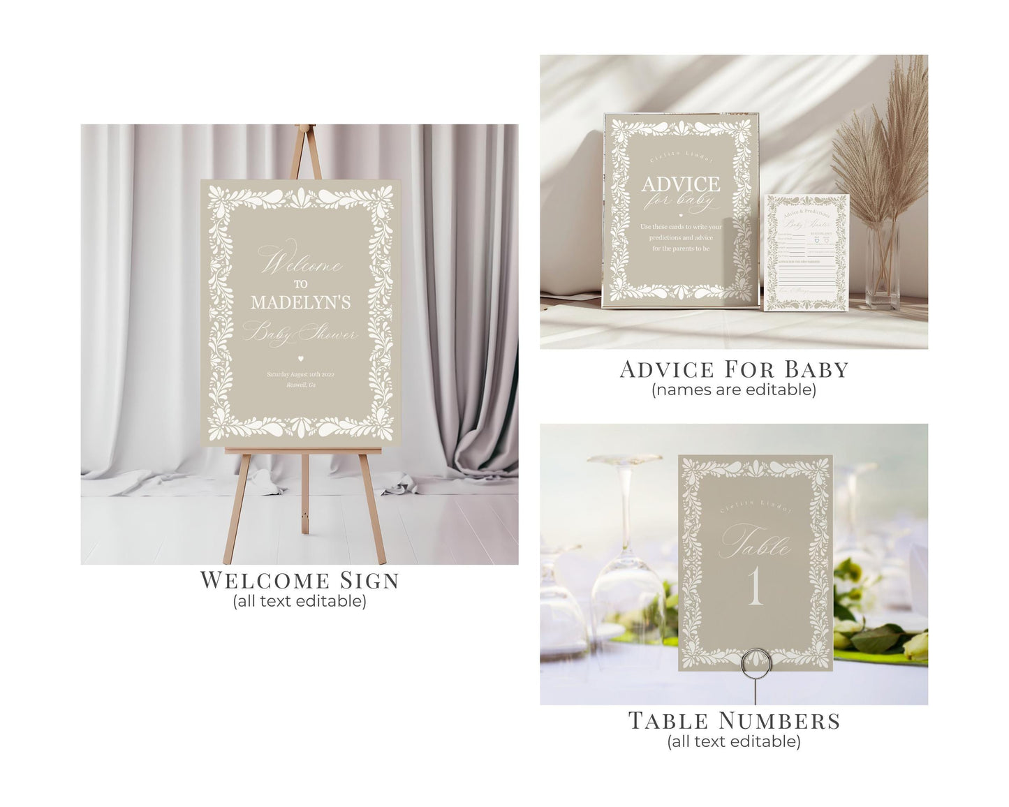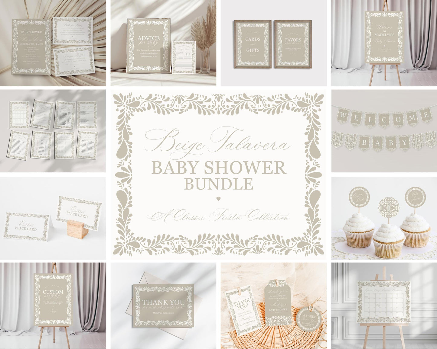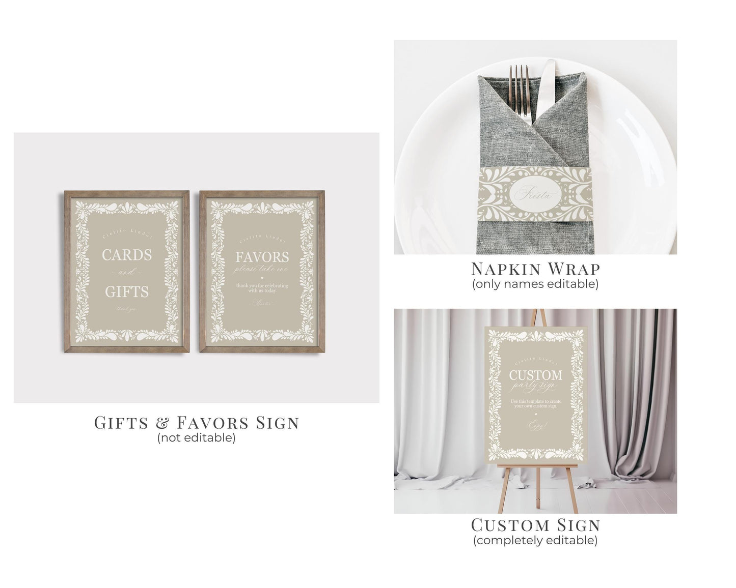 Everyone loves a fiesta! This collection is a neutral blend of elegance and cultural heritage, inspired by the traditional Mexican Talavera tile patterns. The delicate beige floral border exudes sophistication and a touch of festive charm, making it perfect for your Spanish or Mexican inspired celebration. Whether you're hosting a grand fiesta or an intimate gathering, this editable party decor collection can be personalized to reflect your unique event details.