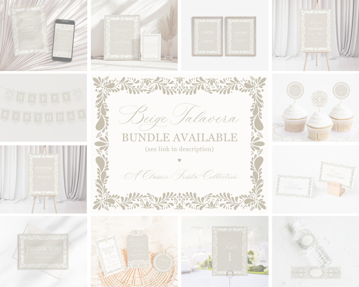 Everyone loves a fiesta! This collection is a neutral blend of elegance and cultural heritage, inspired by the traditional Mexican Talavera tile patterns. The delicate beige floral border exudes sophistication and a touch of festive charm, making it perfect for your Spanish or Mexican inspired celebration. Whether you're hosting a grand fiesta or an intimate gathering, this editable party decor collection can be personalized to reflect your unique event details.