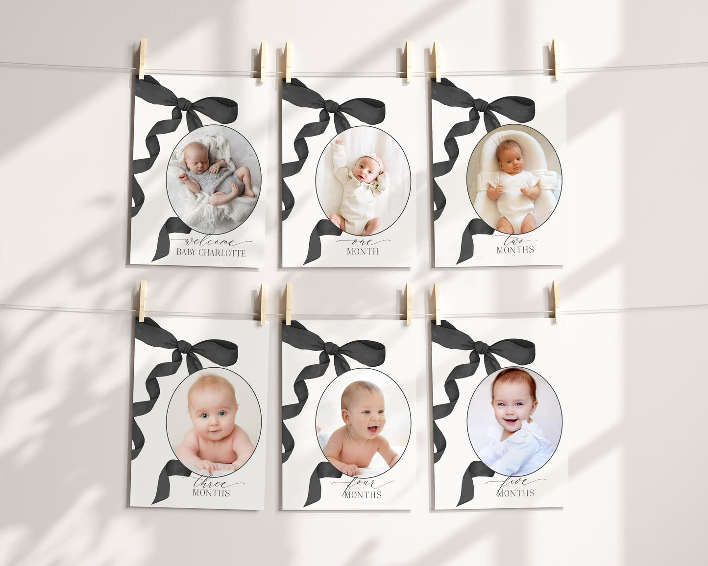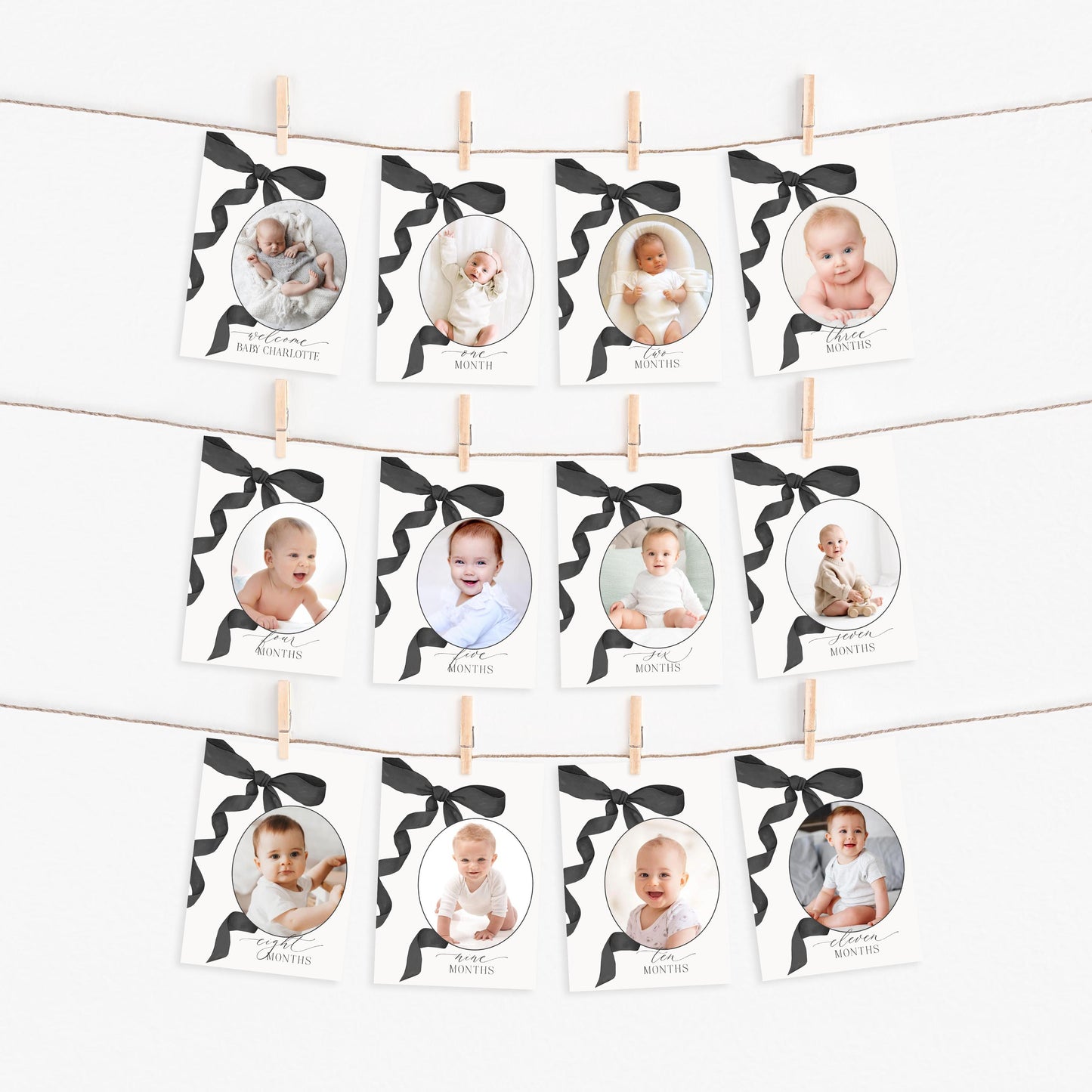Black Bow 1st Birthday Milestone Banner Printable Template, preppy coquette bow theme first birthday party for fancy southern girl