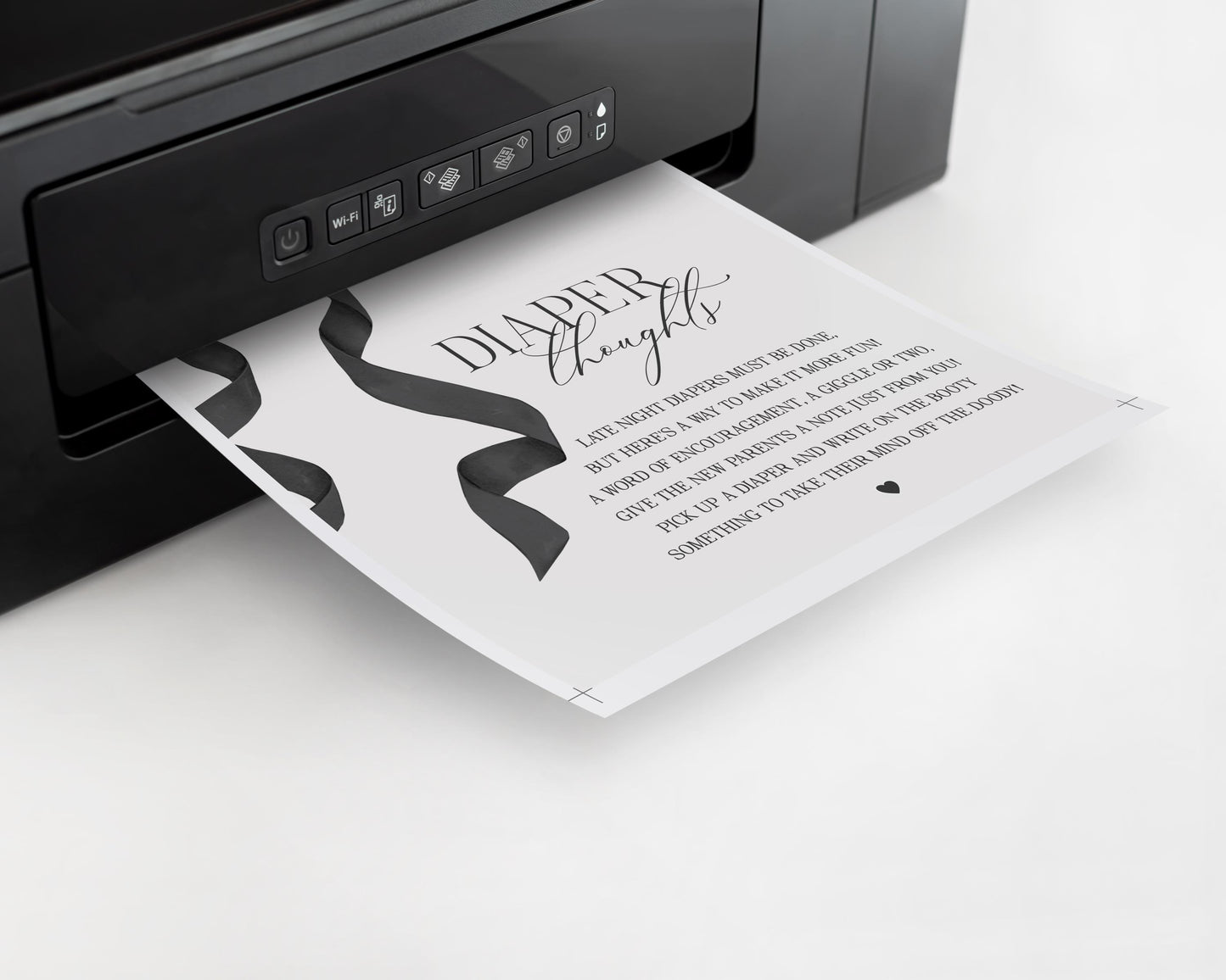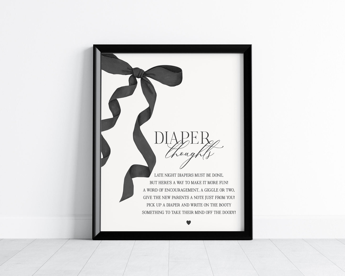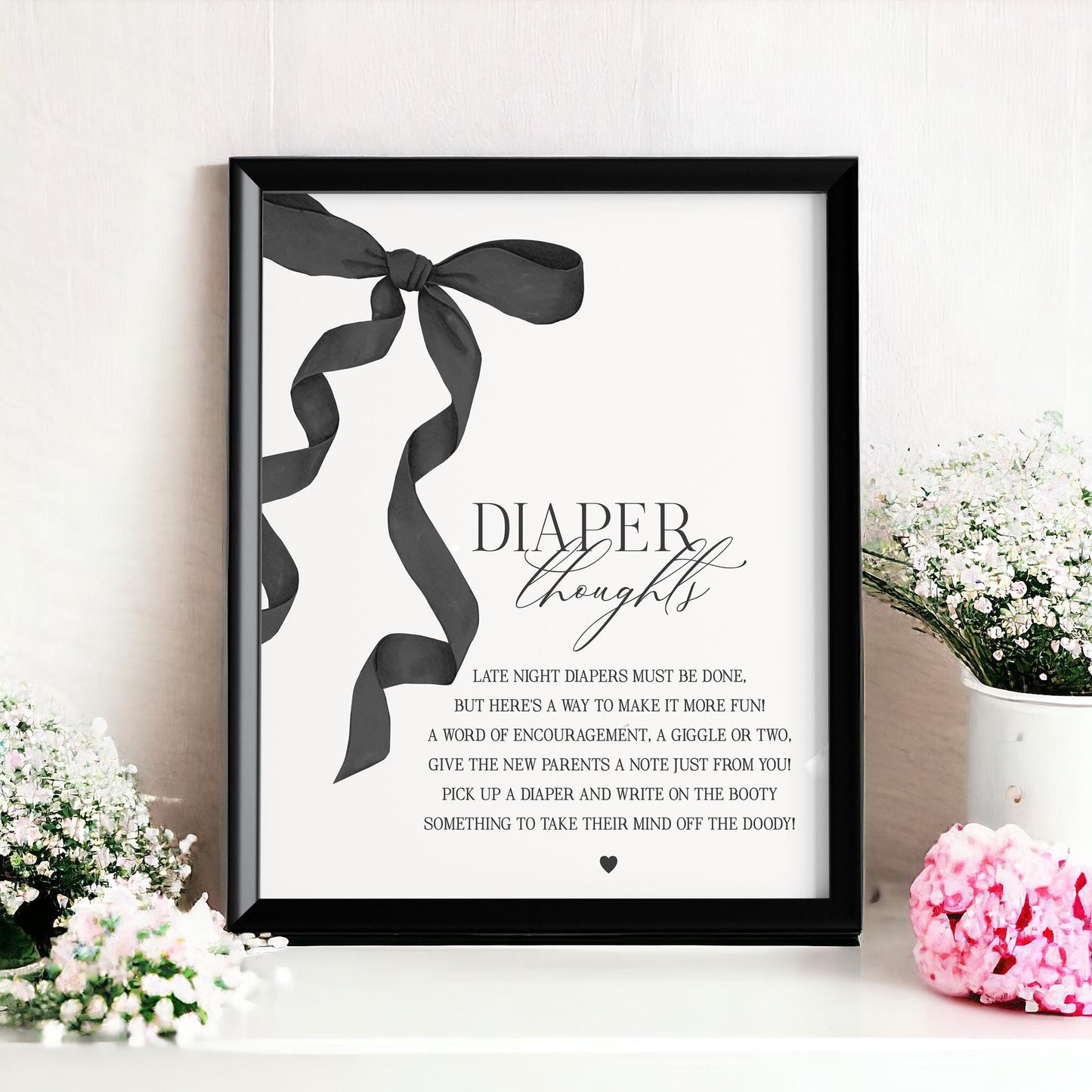 Black Bow Baby Shower Diaper Thoughts Sign Printable Template, preppy coquette bow theme party for baby sprinkle fancy southern girl