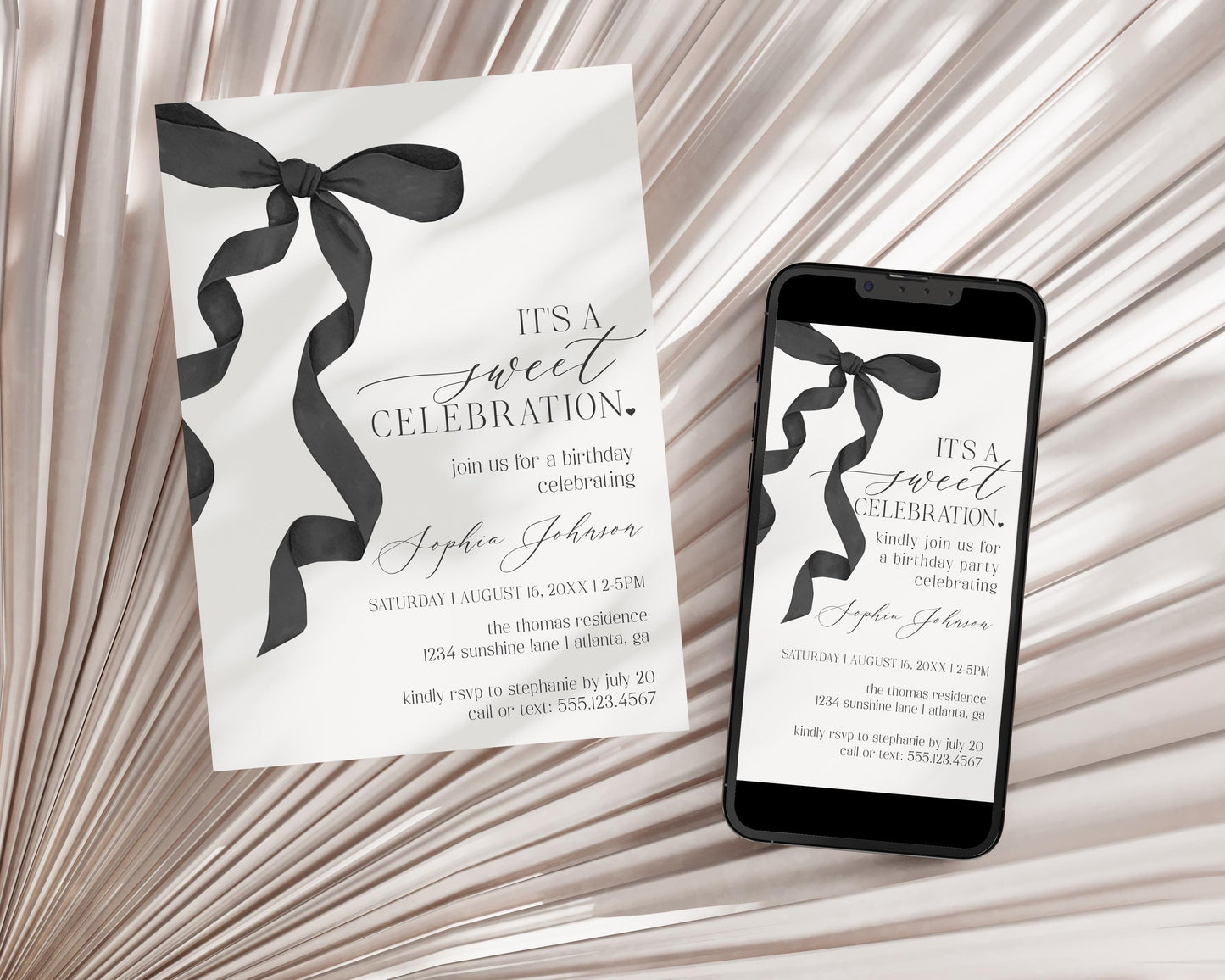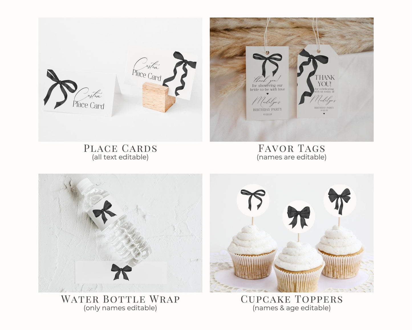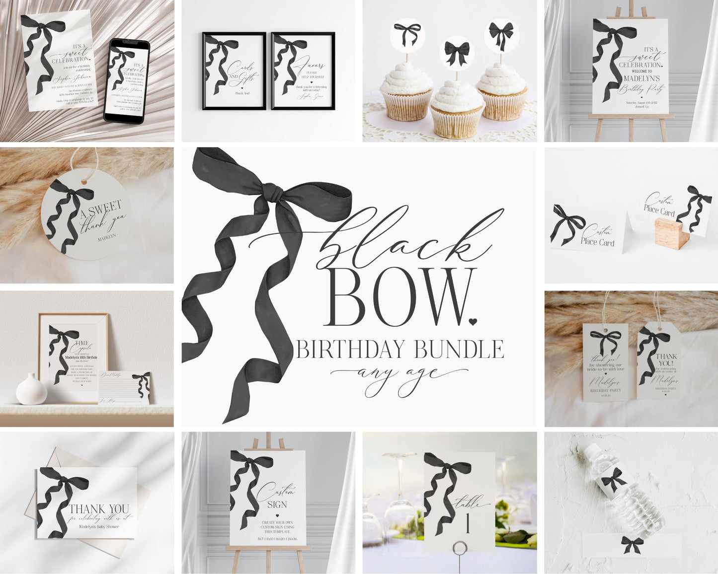 Add some classic elegance to your next celebration with our Black Bow theme party decor. Featuring a fancy black coquette bow on a warm white background, this design effortlessly combines classy and preppy elements. Perfect for the grand millennial style.