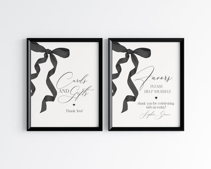 Black Bow Cards & Gifts and Favors Sign Printable Template, preppy coquette bow theme party for fancy southern girl grandmillenial