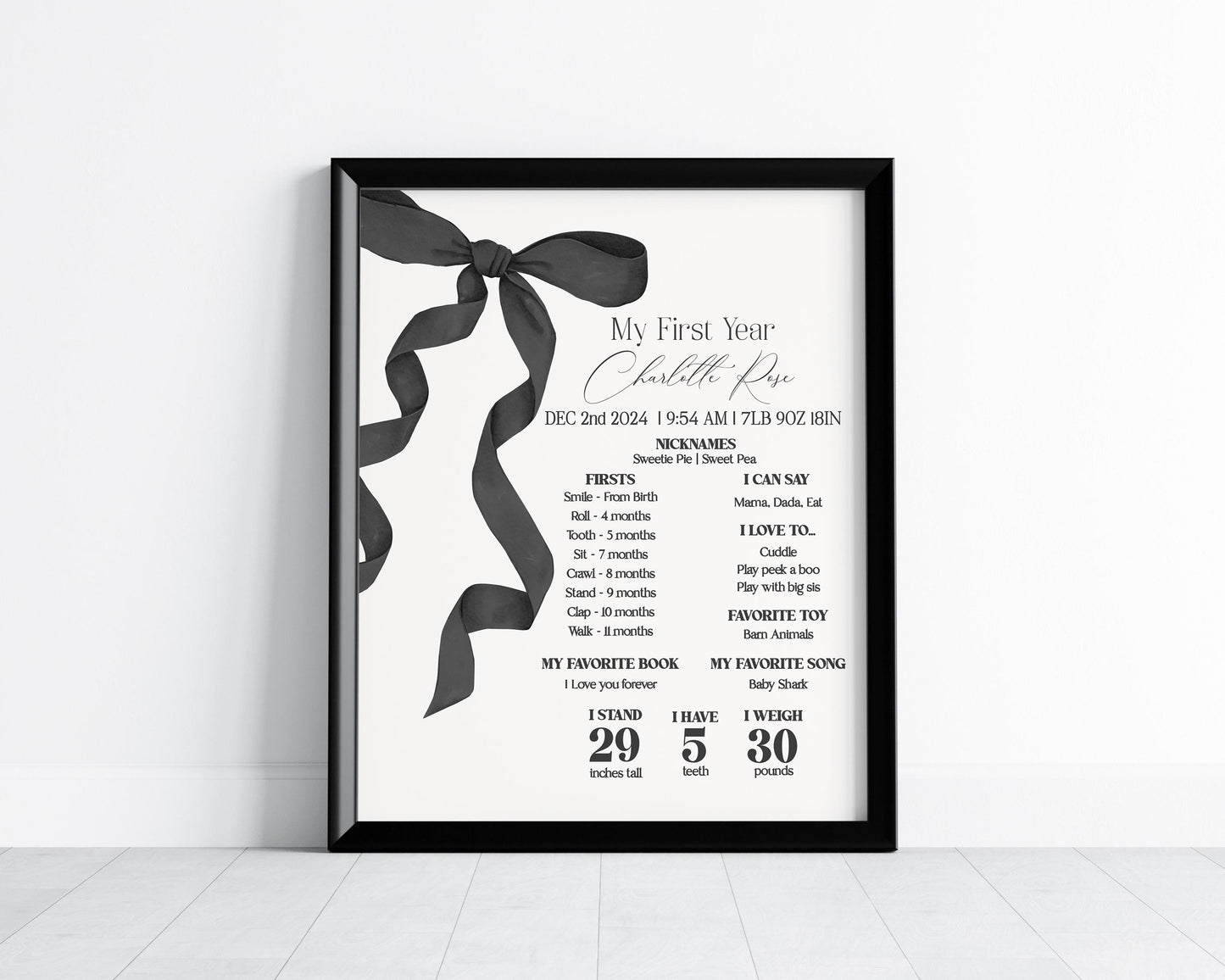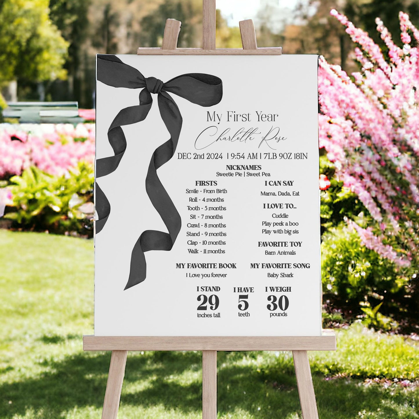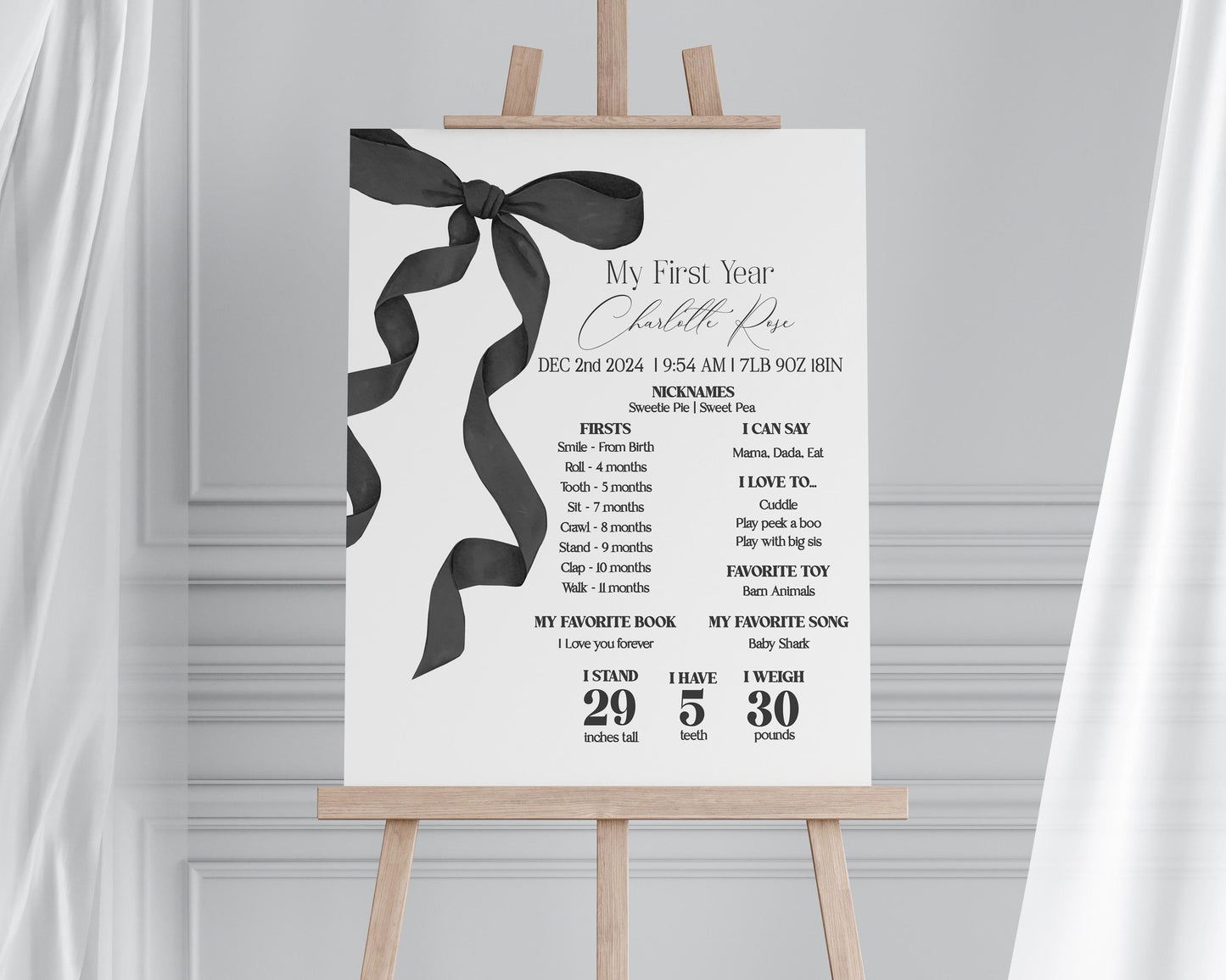 Black Bow First Year Milestone Sign Printable Template, preppy coquette theme party for fancy southern girl grandmillenial bow 1st birthday