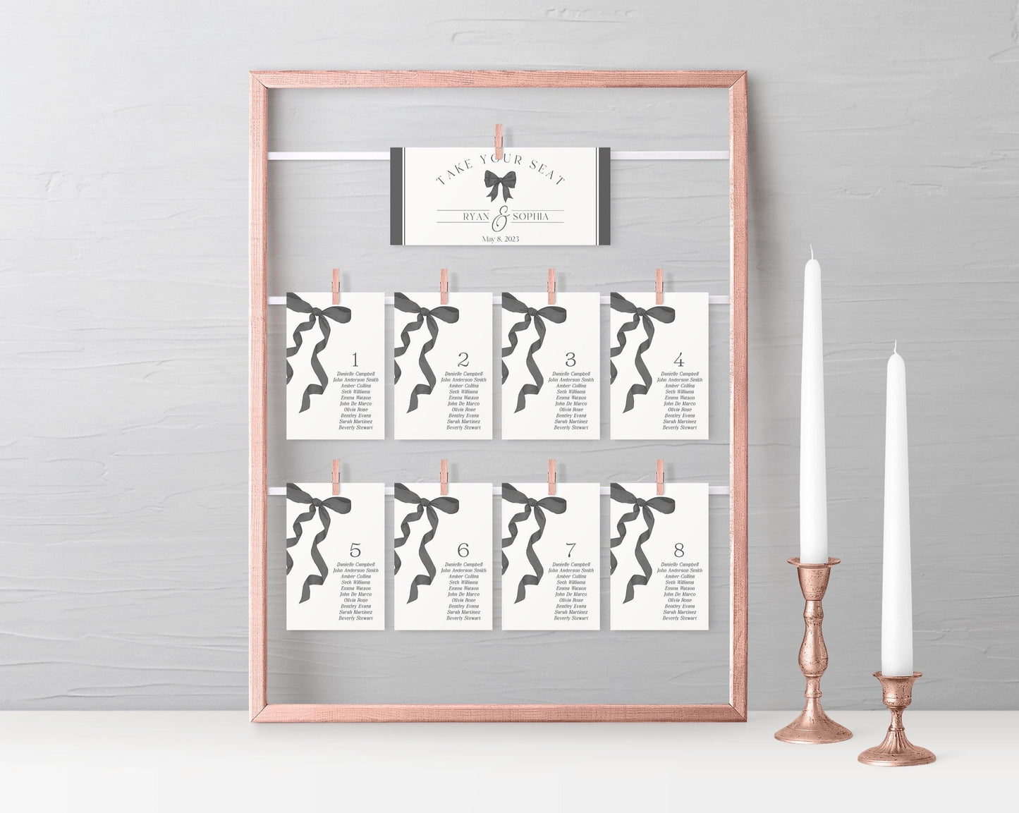 Black Bow Table Number Cards Printable Template, preppy coquette bow theme party for fancy southern wedding grandmillenial bow bridal shower