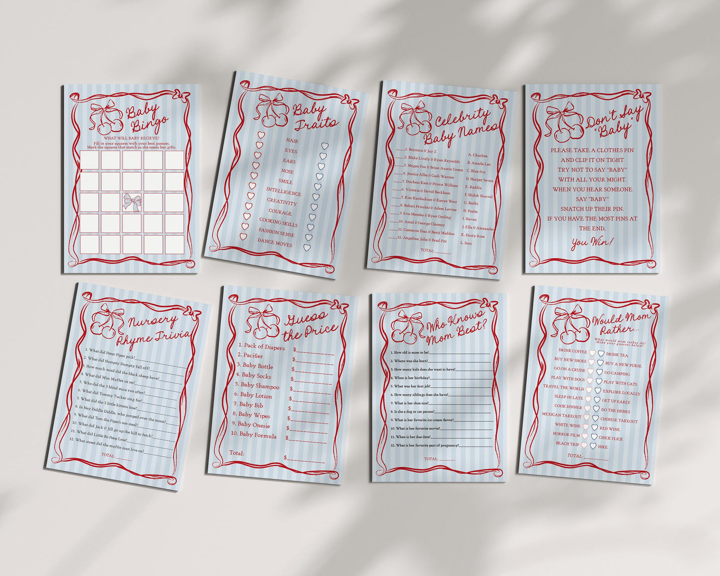 Blue Cherry Coquette Bow Baby Shower Games Template