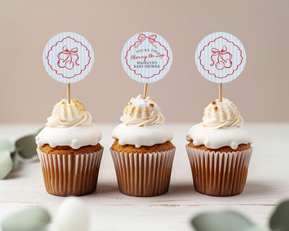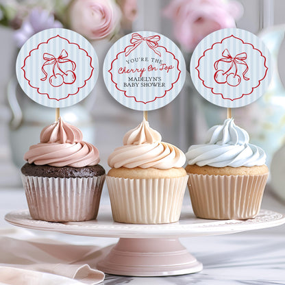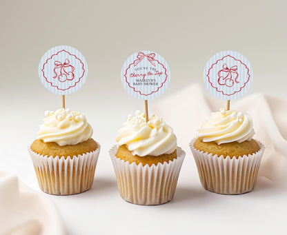Blue Cherry Coquette Bow Cupcake Toppers Printable, Cherry on Top Baby Shower, Cherry Sweet Bridal Shower, Hand Drawn Birthday Party WP1039