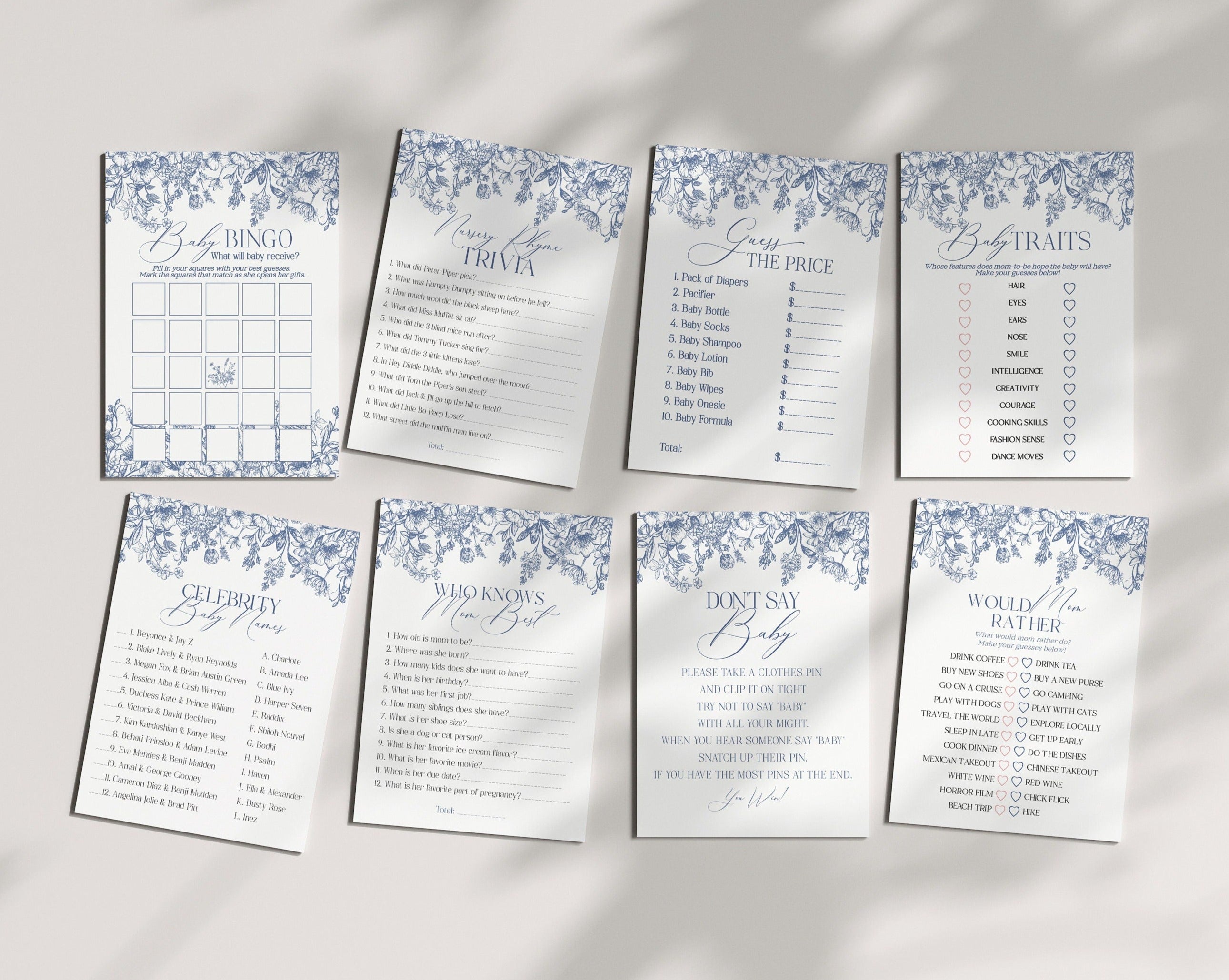 Blue Chinoiserie Baby Shower Games Set Printable Template, Blue Baby in Bloom spring baby shower Toile Shower Decor for French Baby Shower
