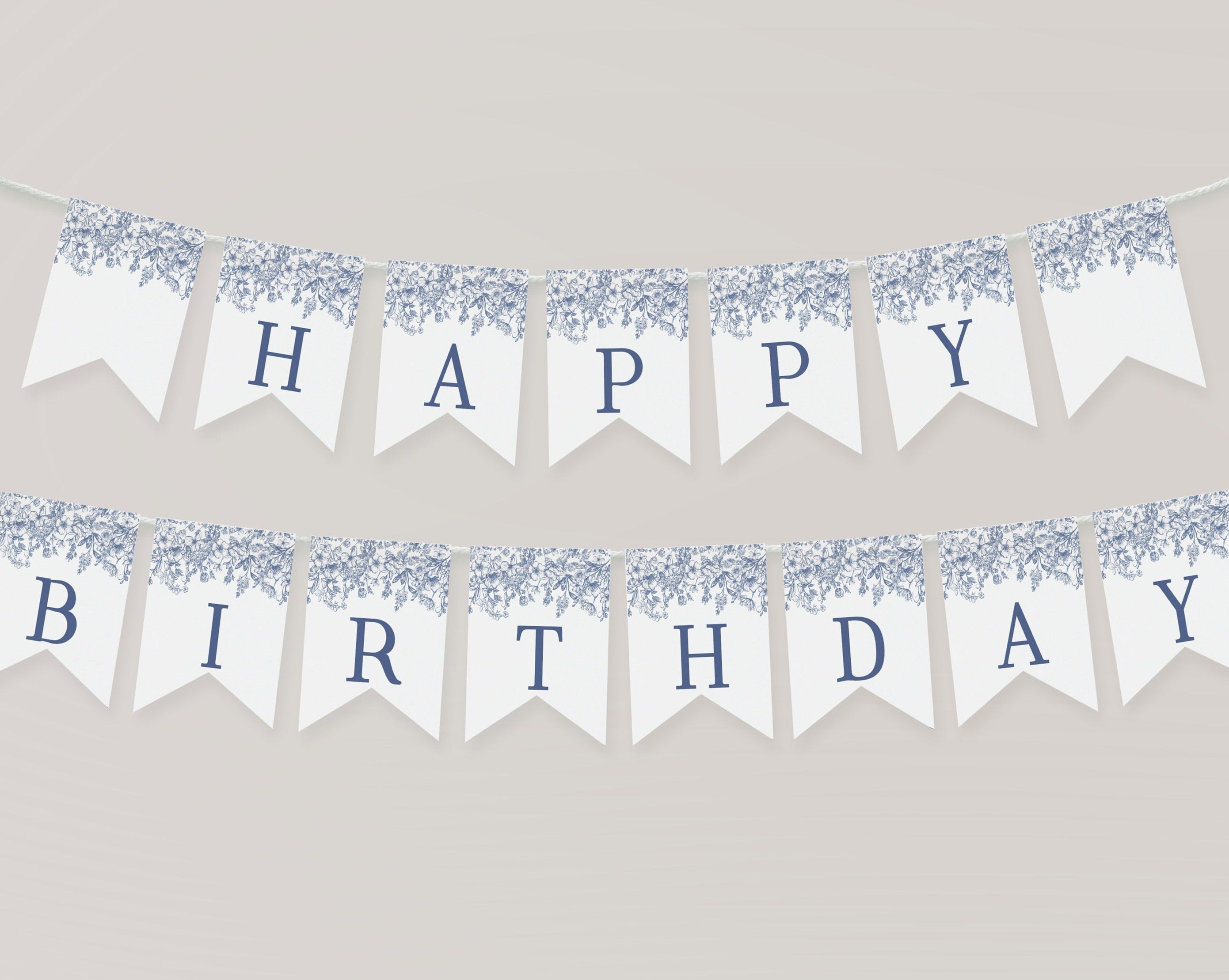 Blue Chinoiserie Happy Birthday Banner Printable Template, Elegant Blue Toile Decor for Birthday Party, French Theme Birthday Party Spring