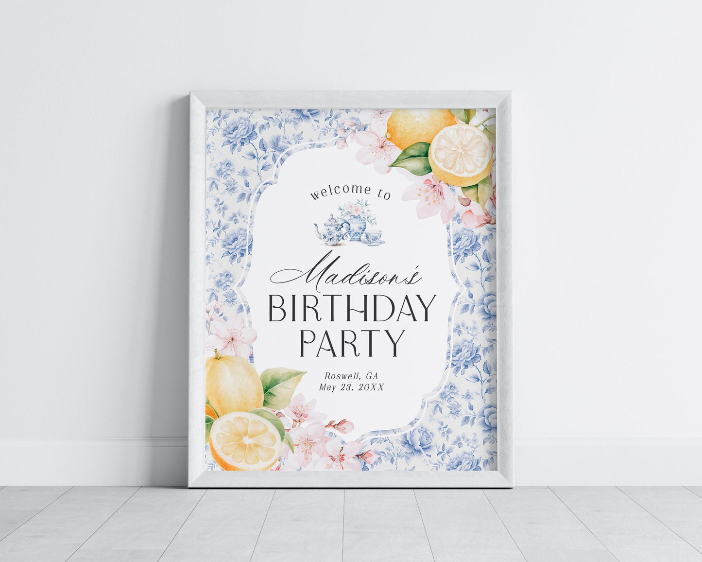 Blue Chinoiserie Tea First Year Milestone Sign Printable Template, Lemon High Tea Party Girl Birthday Par-tea Blue Willow Toile Garden Party