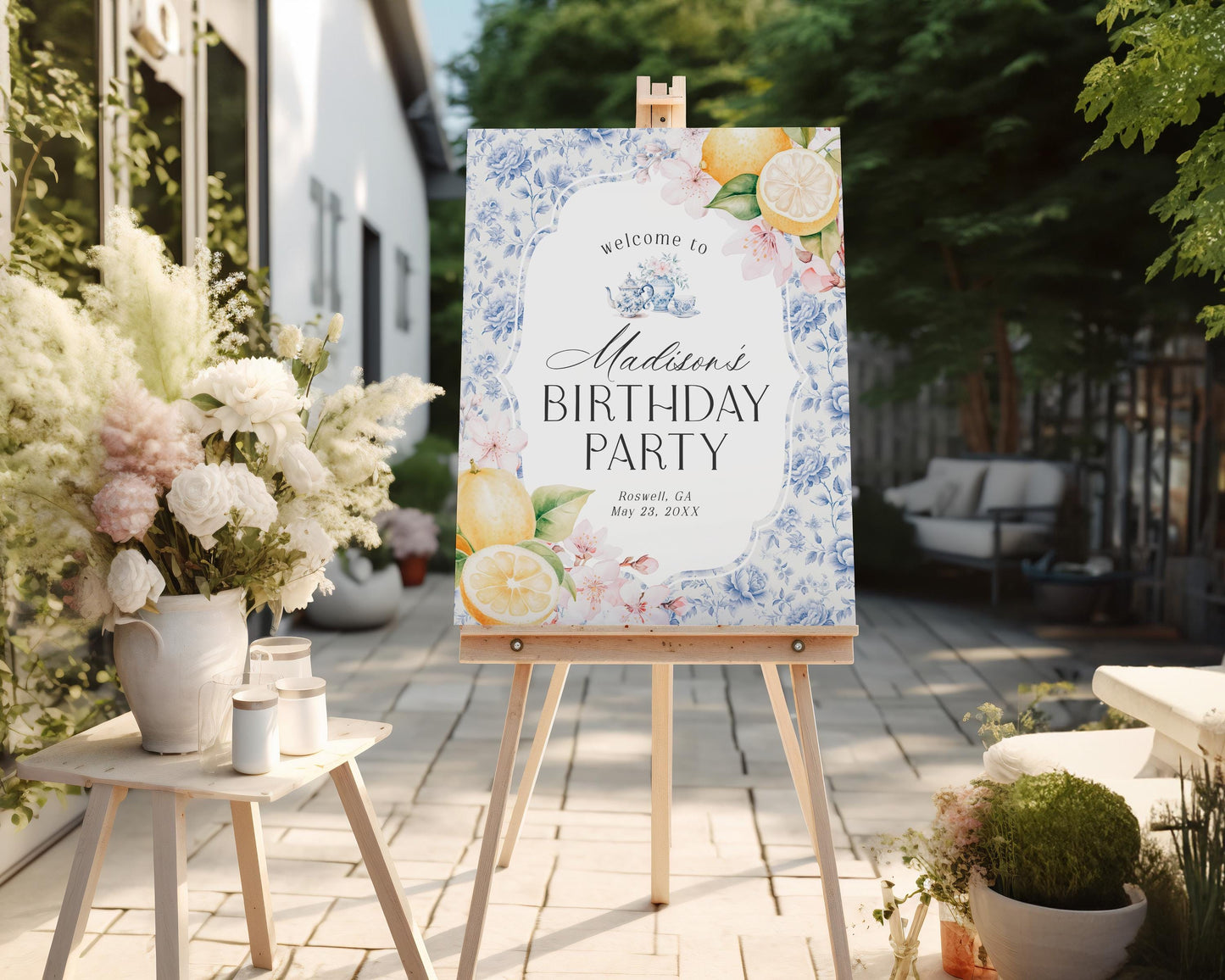 It’s time to Par-tea! Elevate your next birthday party with this delicate bouquet of light blue chinoiserie florals. This whimsical floral theme is inspired by the charm of a French garden, featuring a pastel toile pattern with zesty lemons and soft pink flowers.