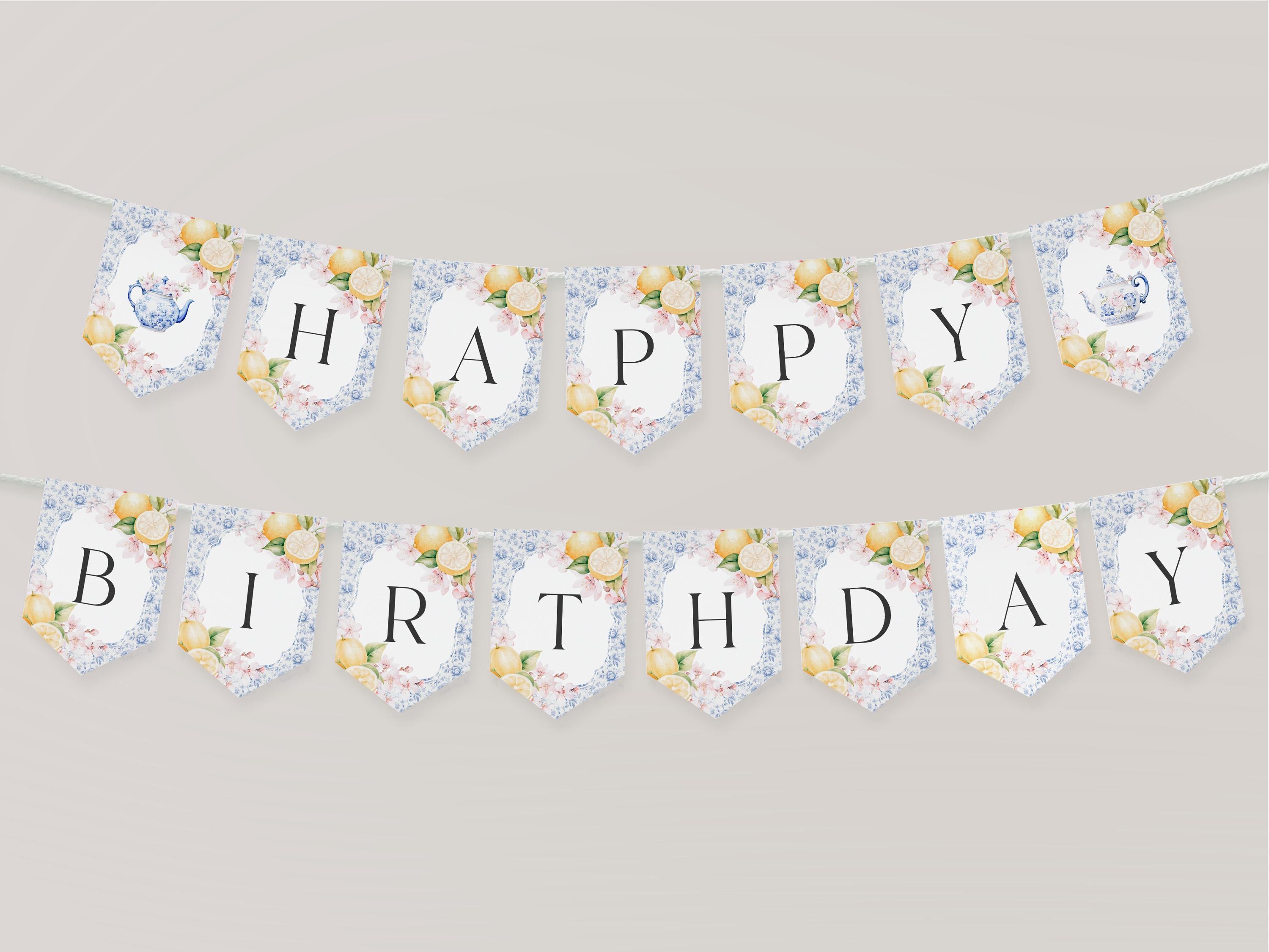 Blue Chinoiserie Tea Birthday Shower Banner Printable Template, High Tea Party for Girl Birthday Par-tea, Blue Willow Toile Lemon Garden