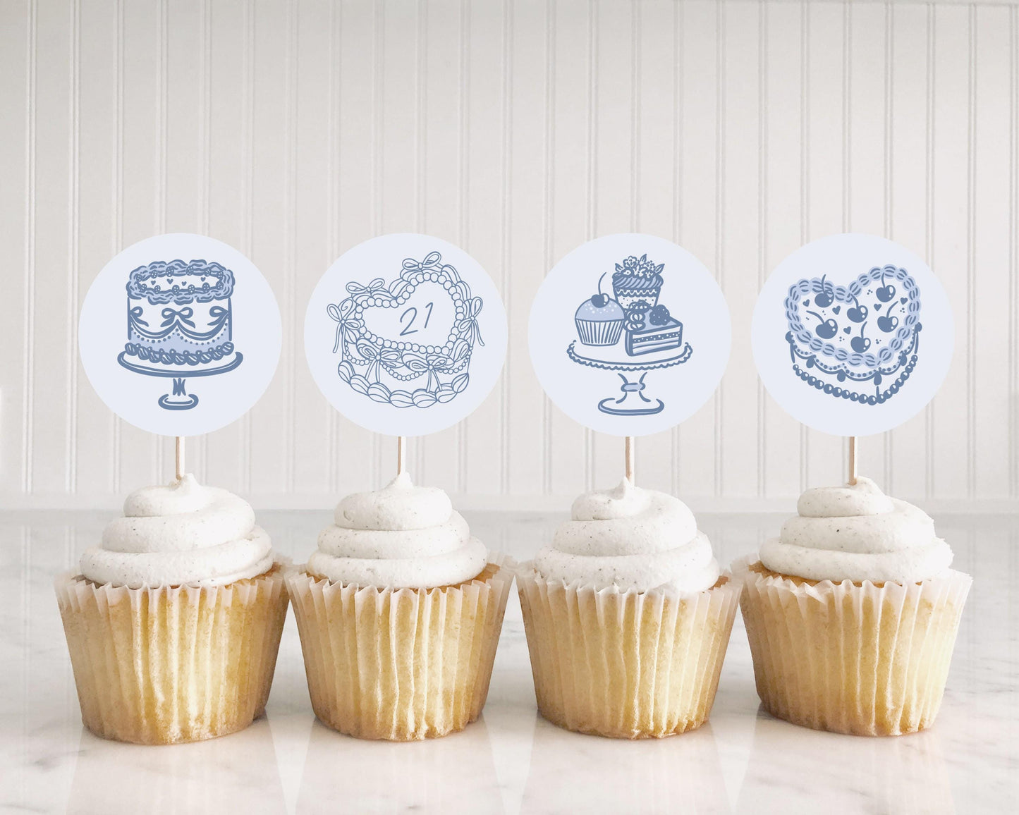 Blue Coquette Heart Cake Birthday Cupcake Toppers Printable Template