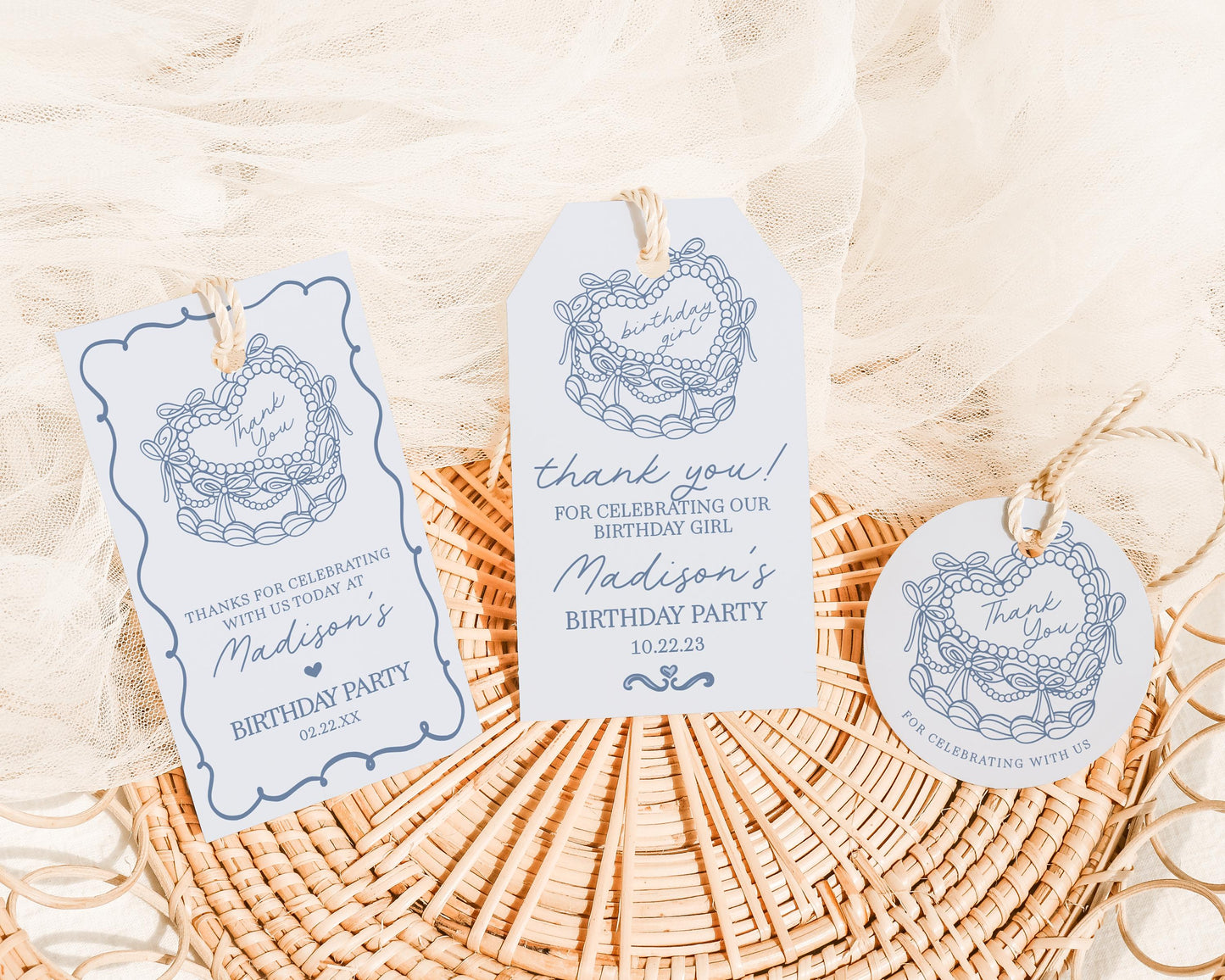 Blue Coquette Heart Cake Birthday Favor Tags Printable Template