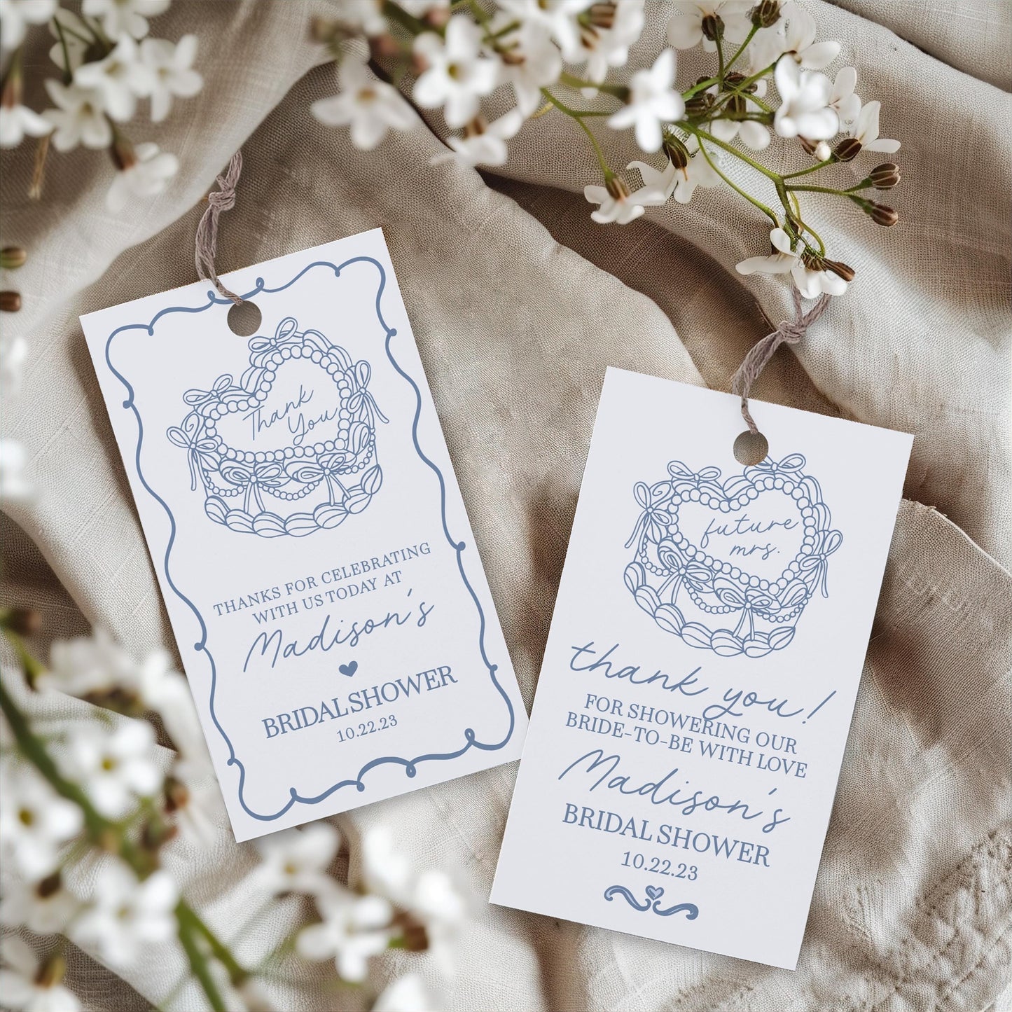 Blue Coquette Heart Cake Bridal Shower Favor Tags Printable Template, Vintage Blue Bow French Theme Retro Wedding Cake Bridal Brunch WP1034