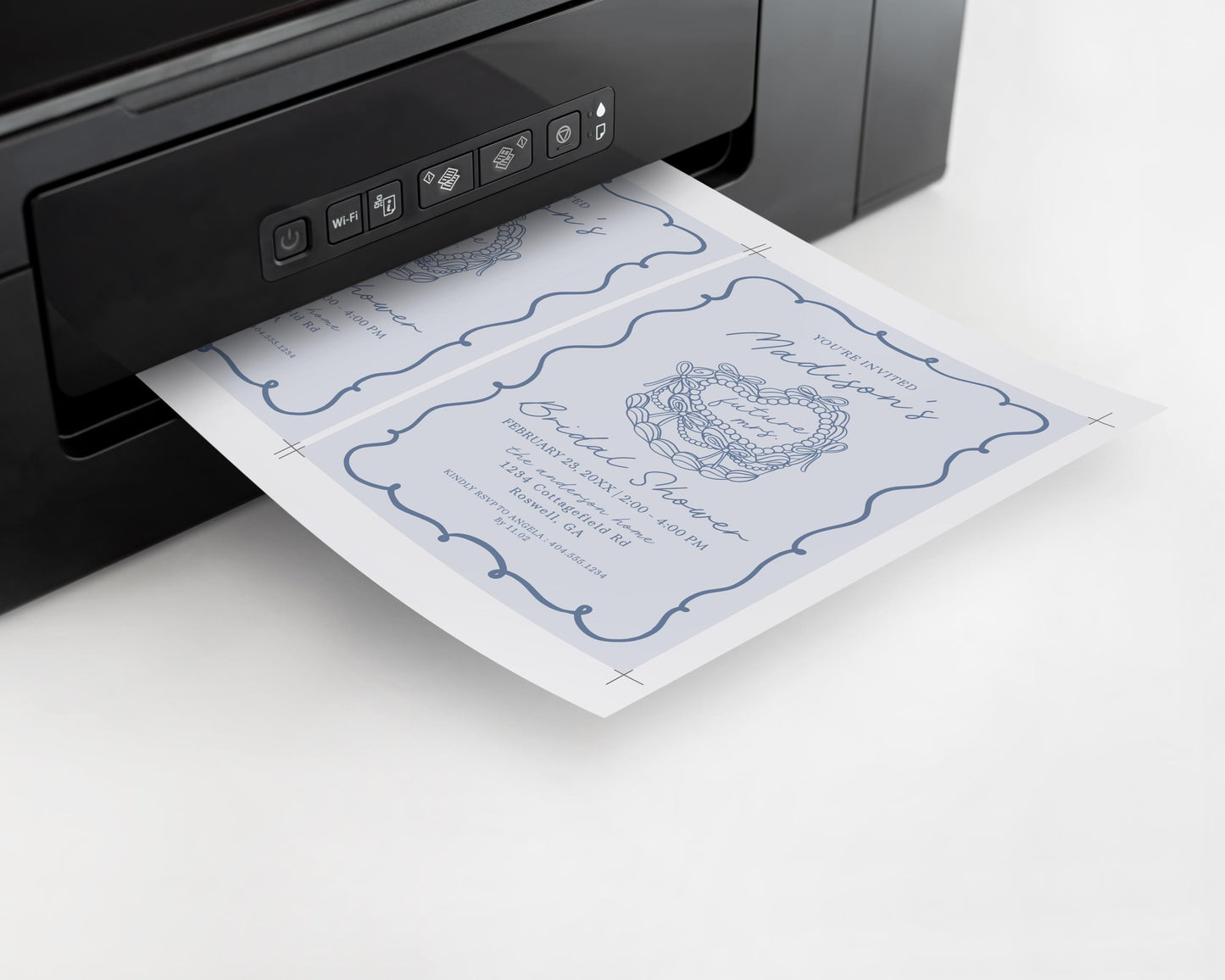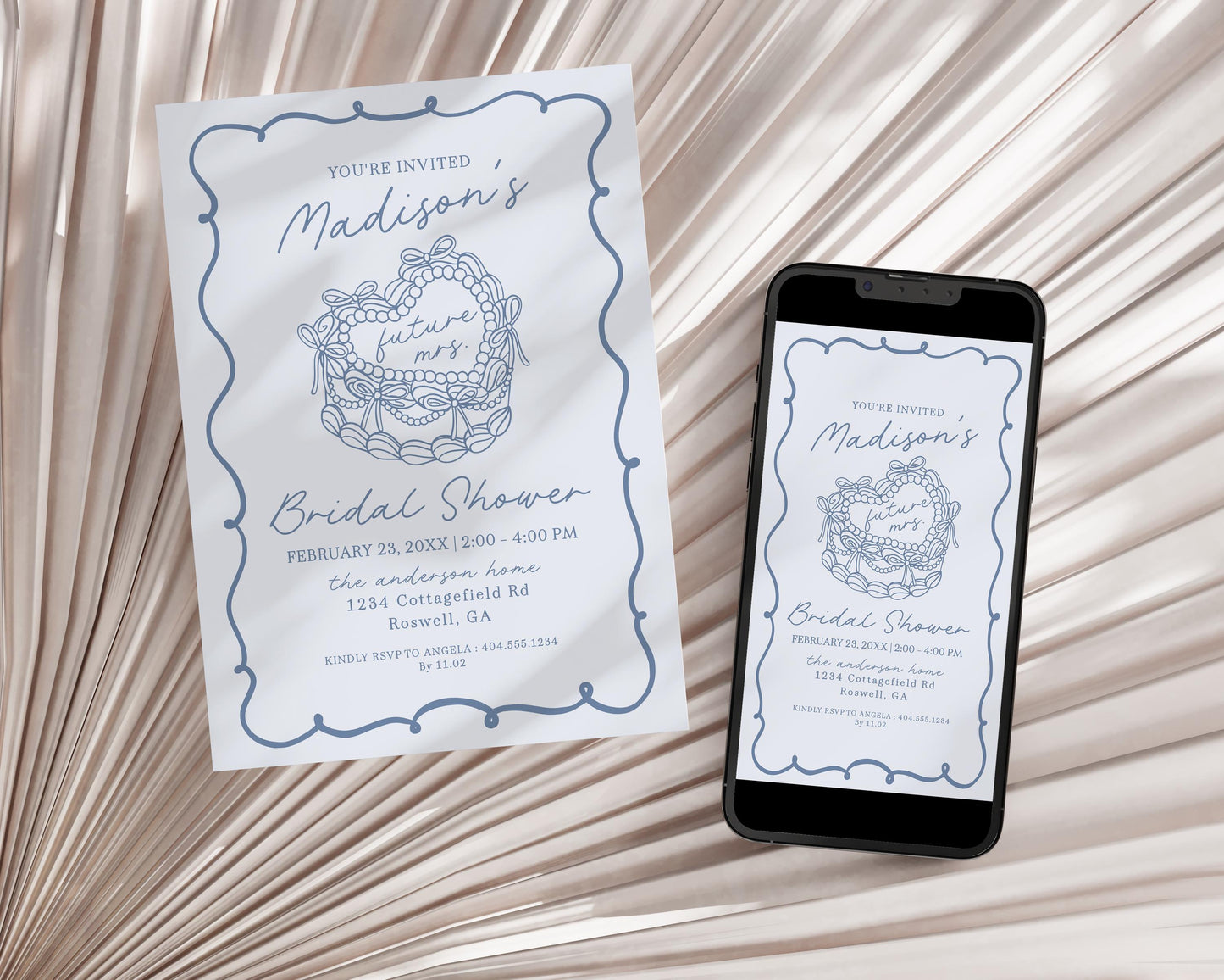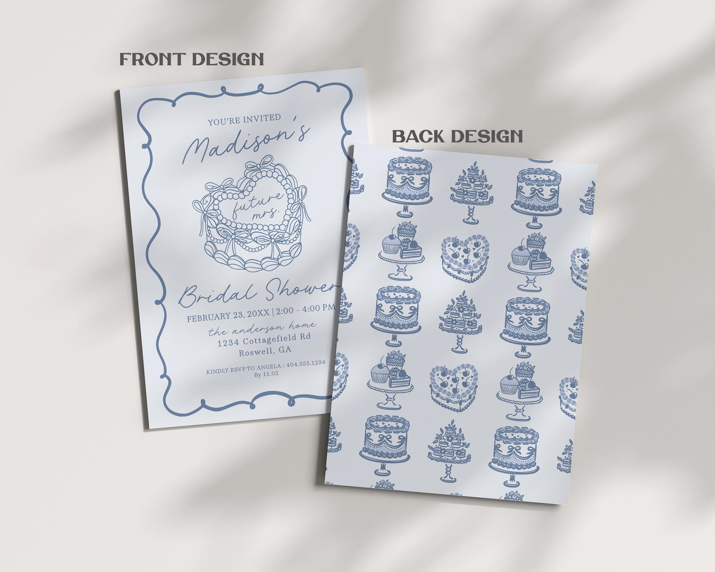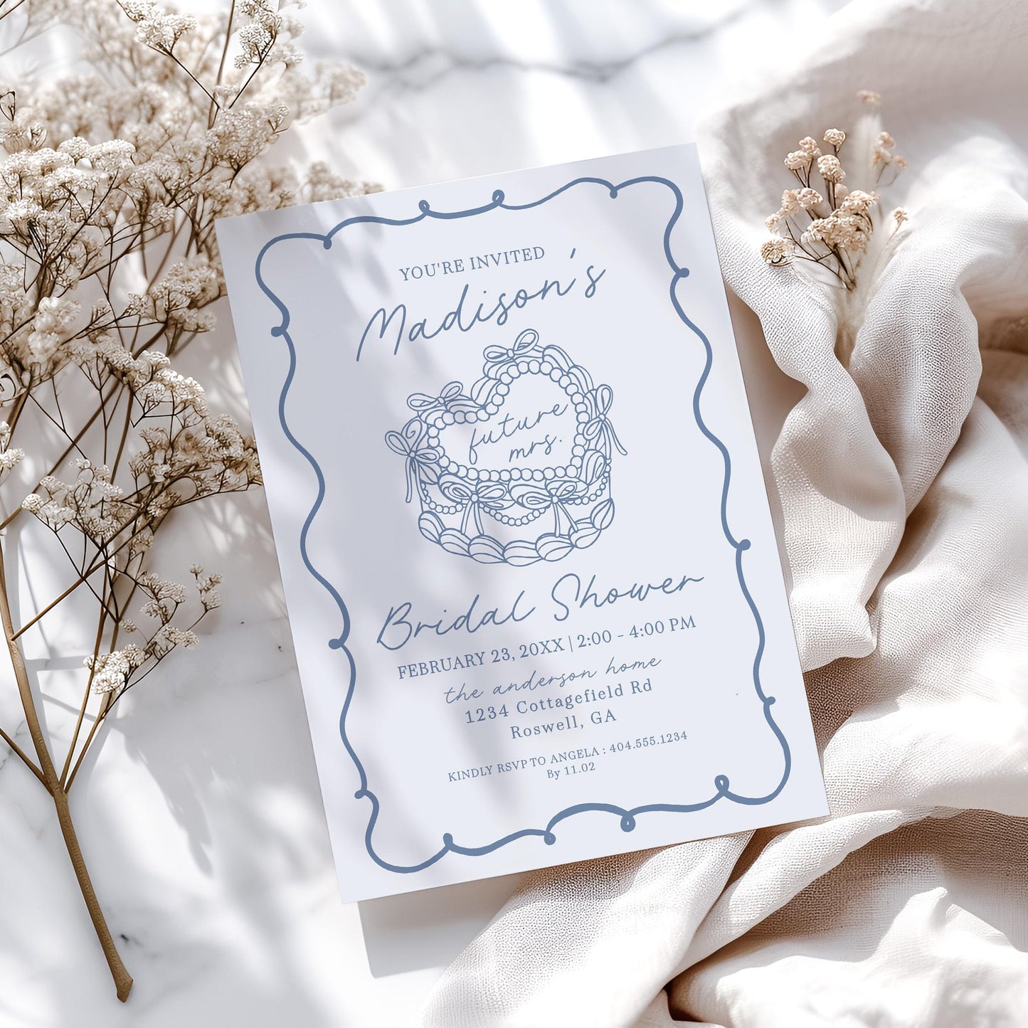 Blue Coquette Heart Cake Bridal Shower Invitation Template, Vintage Blue Bow French Theme Retro Wedding Cake Bridal Brunch WP1034