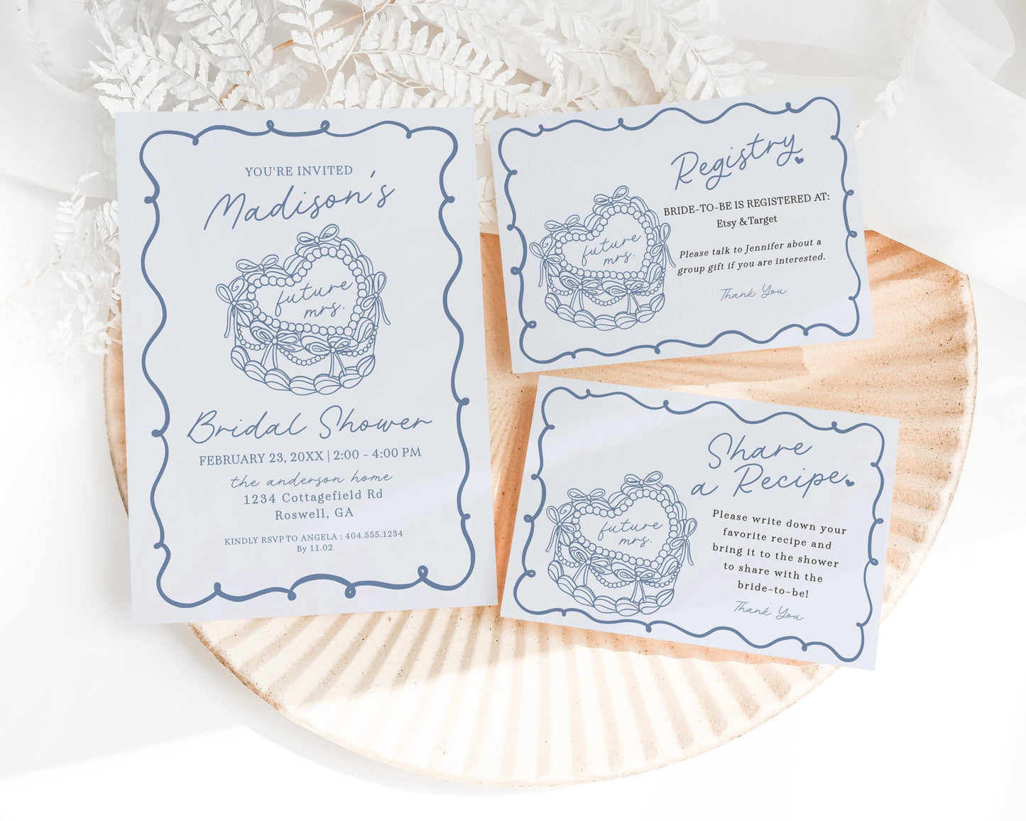 Blue Retro Coquette Heart Cake Bridal Shower Bundle Printable Template