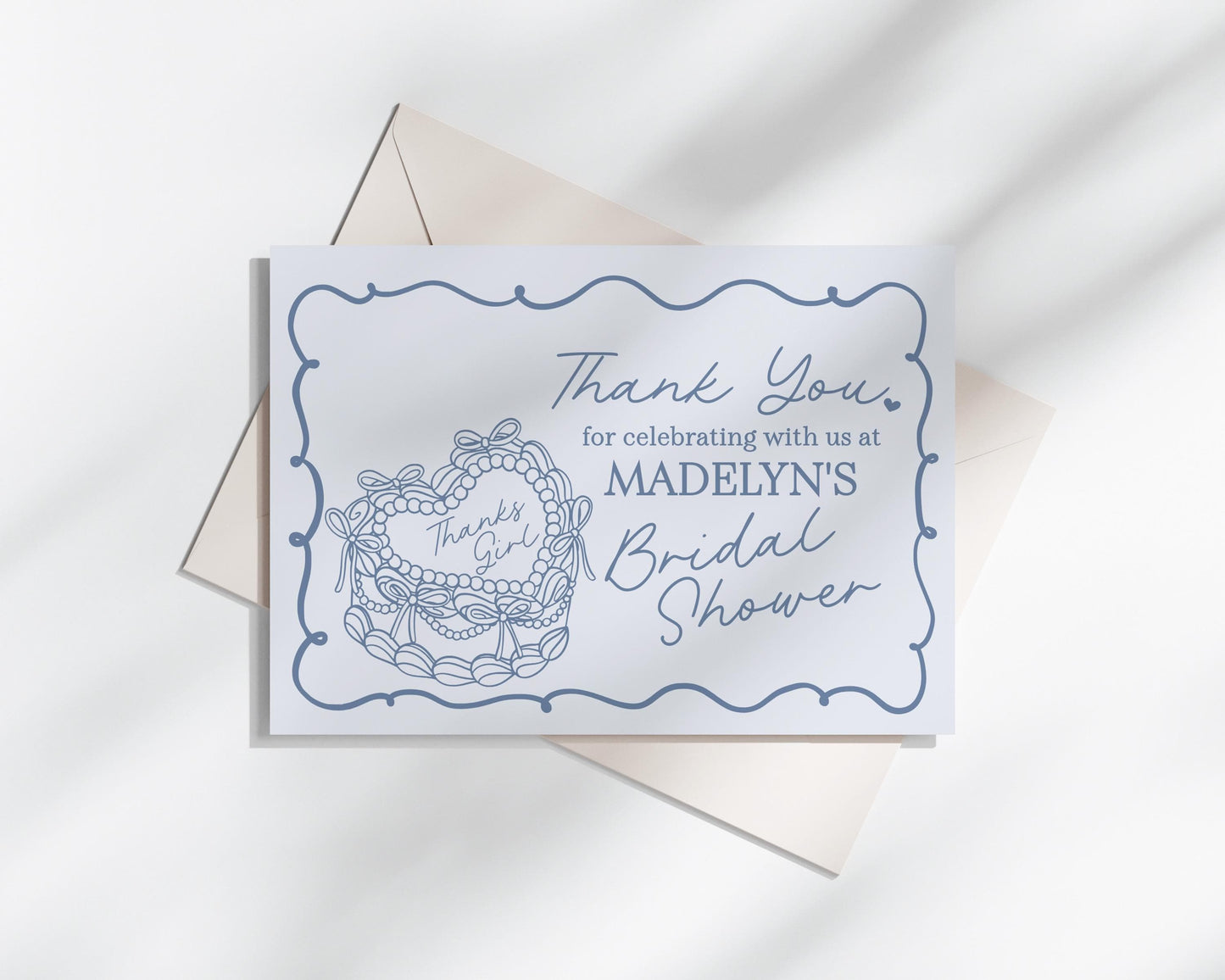 Blue Coquette Heart Cake Thank You Card Printable Template, Birthday Blue Bow Sweet February Valentines Bridal Shower Party Decor WP1034