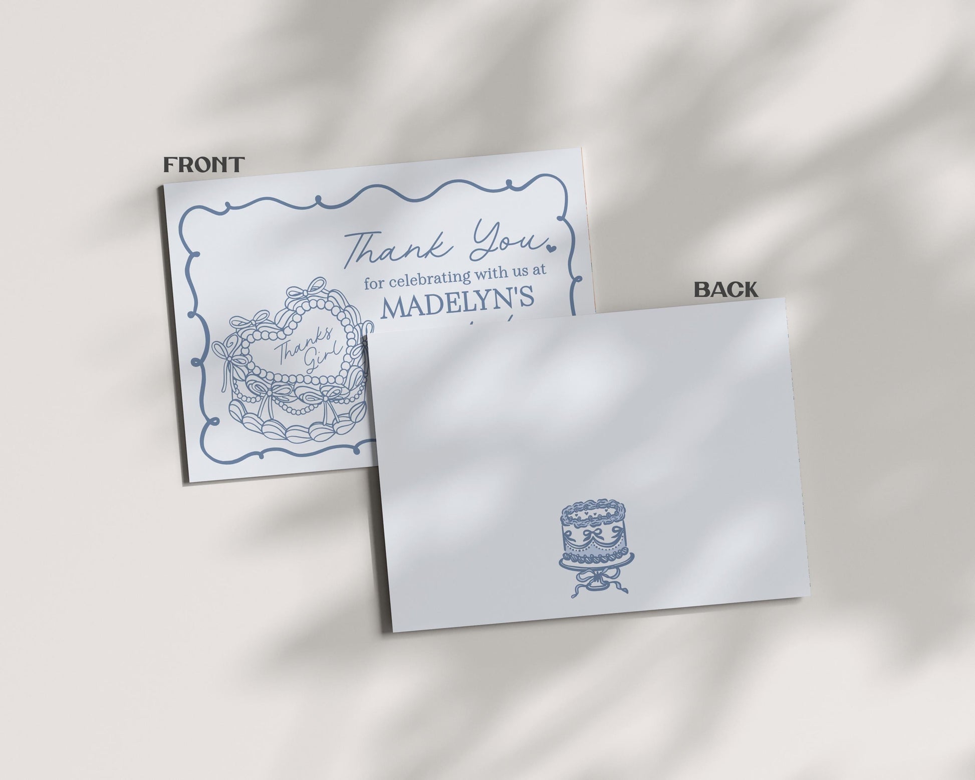 Blue Coquette Heart Cake Thank You Card Printable Template