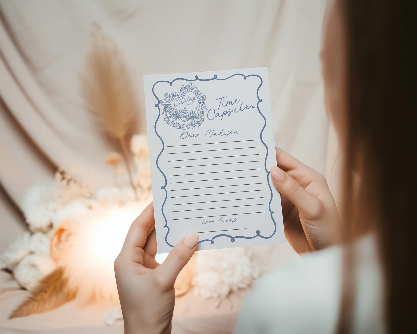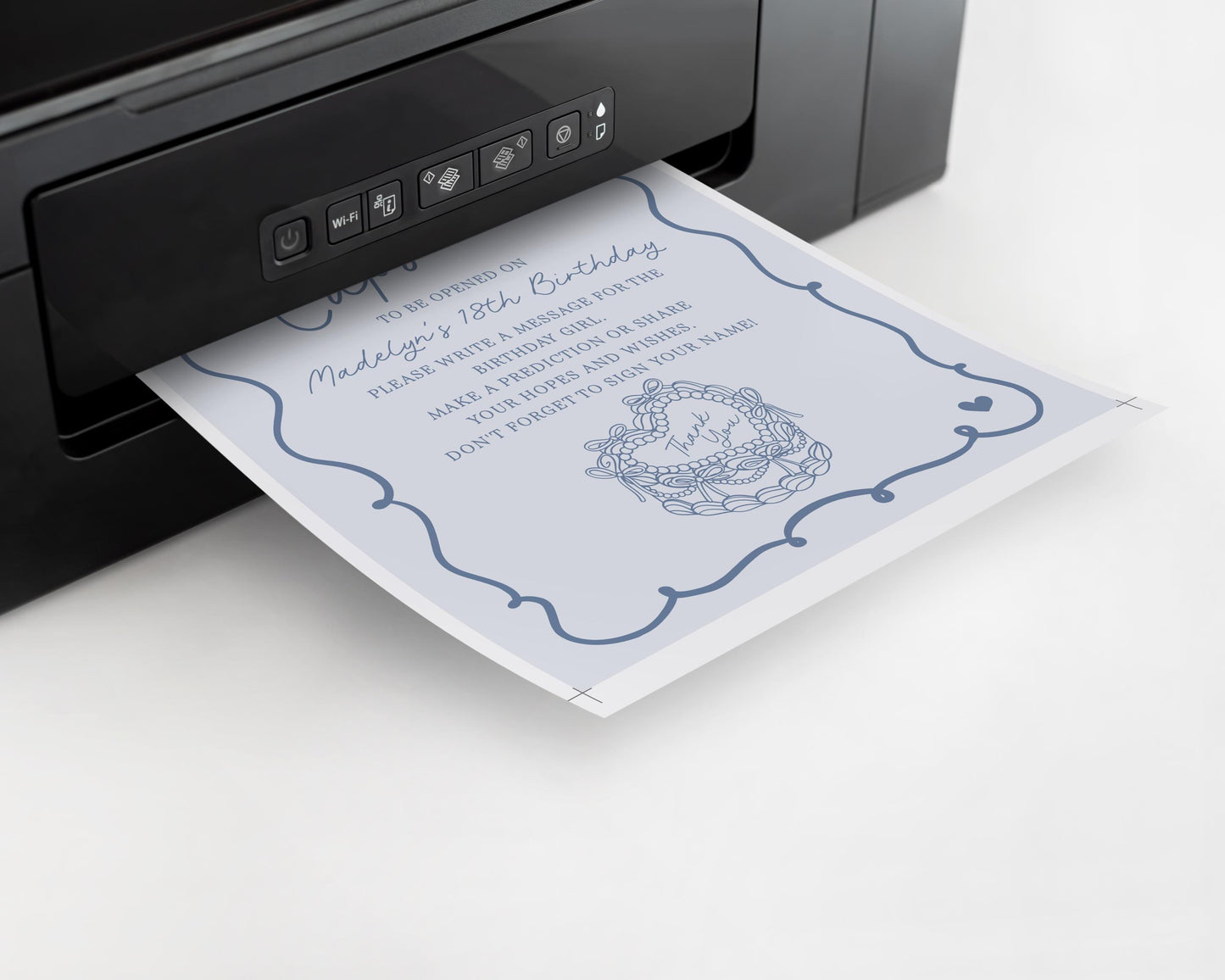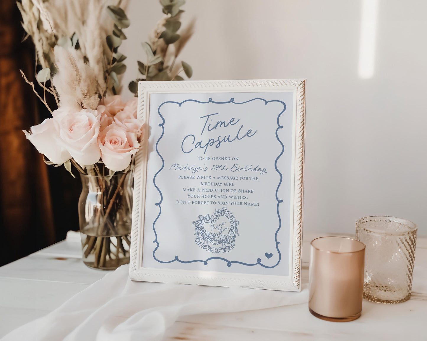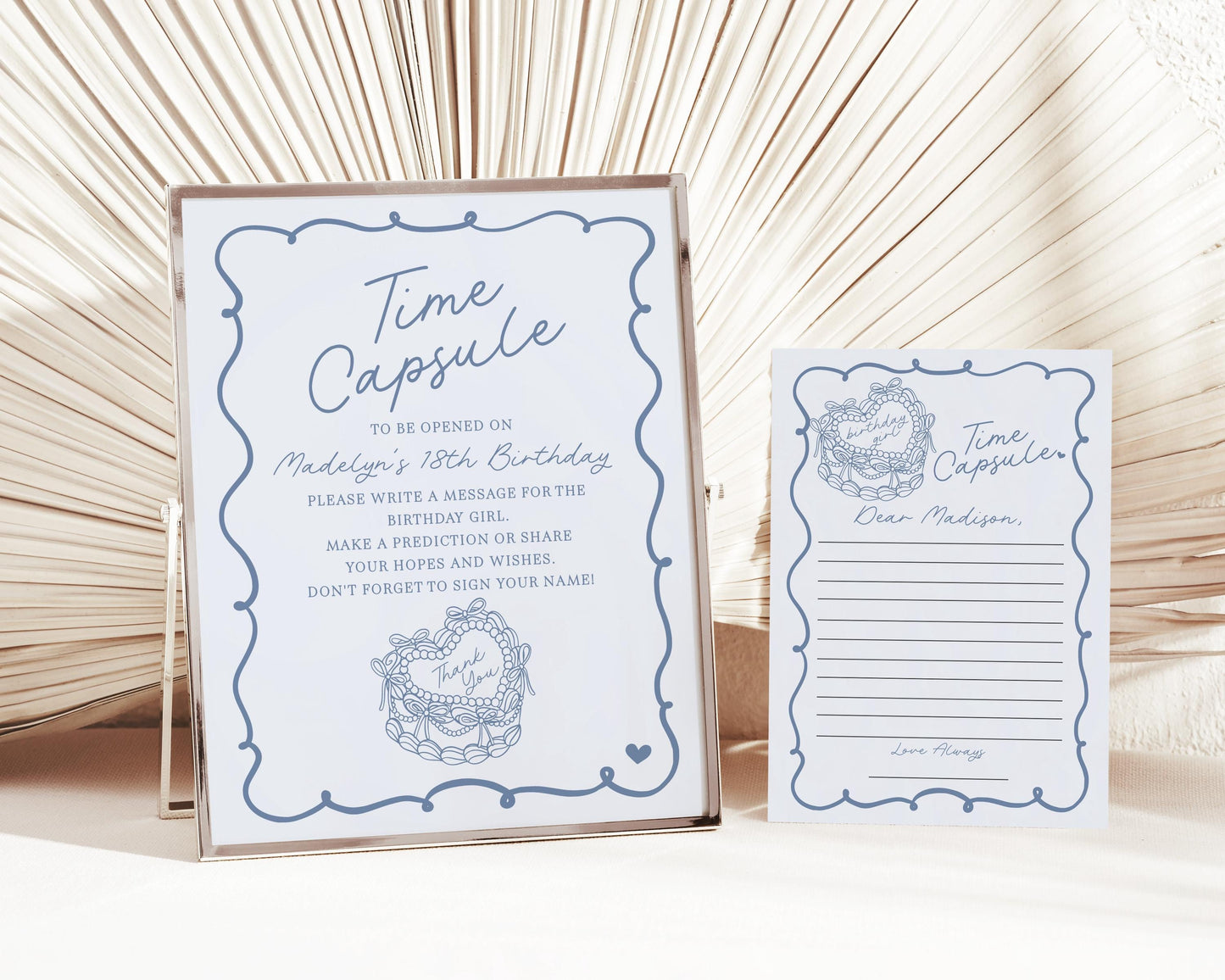 Blue Coquette Heart Cake Time Capsule Template, Vintage French Theme, Vintage Blue Bow Cake for Sweet February Birthday Party Decor WP1034