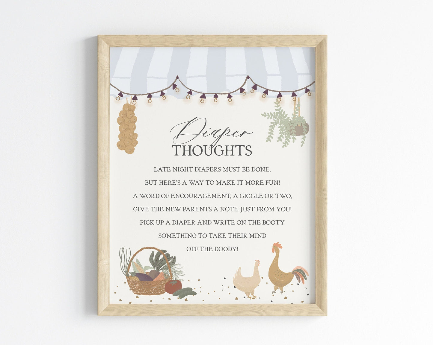 Blue Farmers Market Baby Shower Diaper Thoughts Sign Printable Template, Farm Fresh Party for Gender Neutral Baby Shower Locally Grown Decor