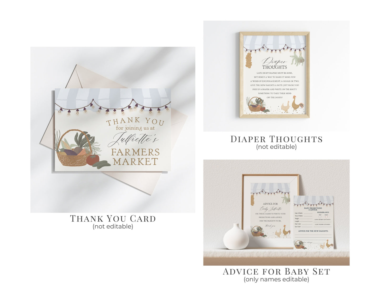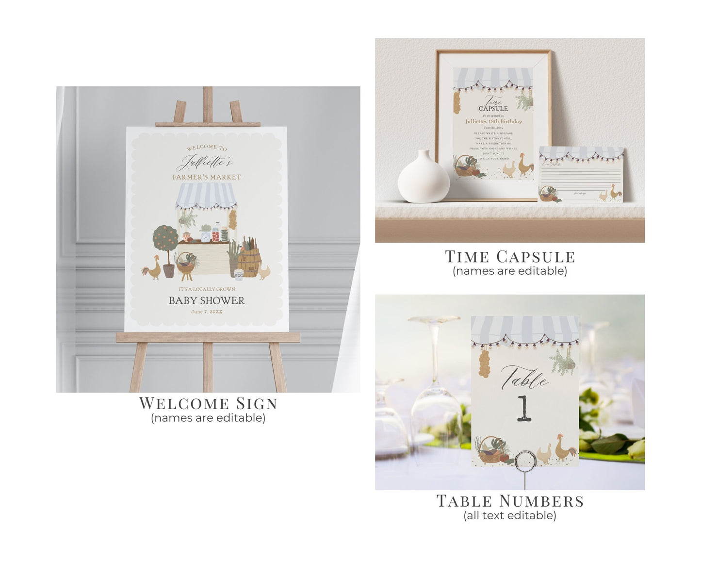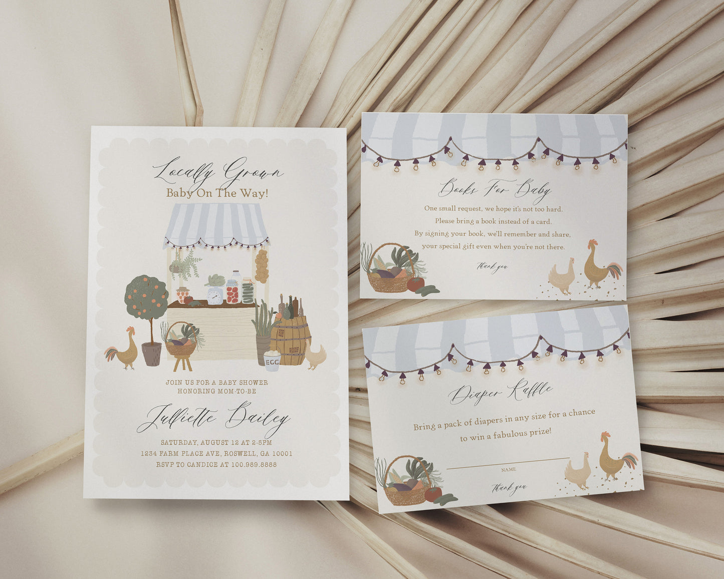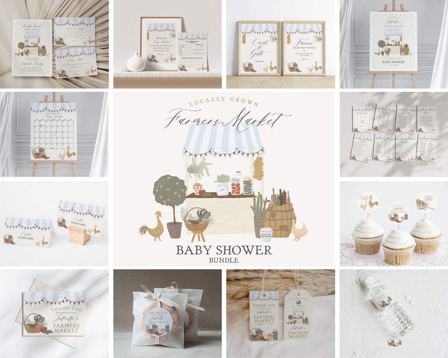 There’s A Locally Grown Baby on the Way! Elevate your next party with the authentic charm of an outing at your local Farmers Market. This collection features an adorable blue farmers market stand accented with market-fresh treasures. A party brimming with farm-fresh delights and the spirit of community.