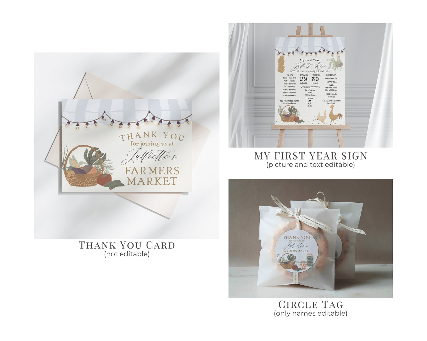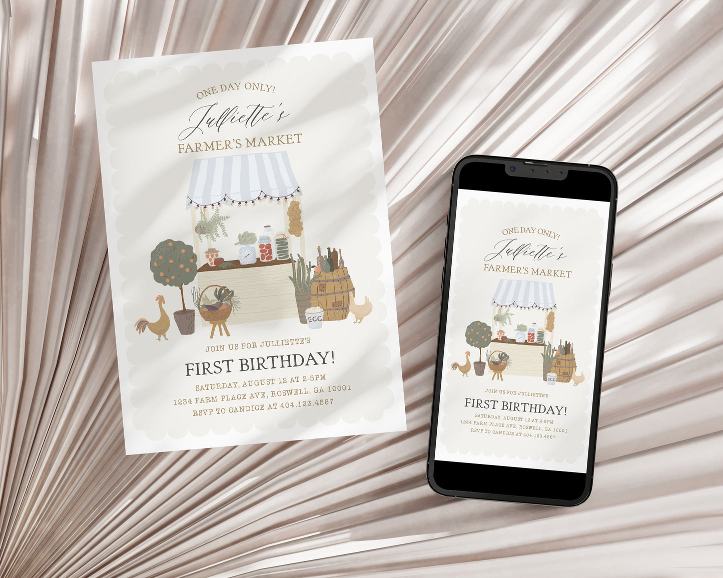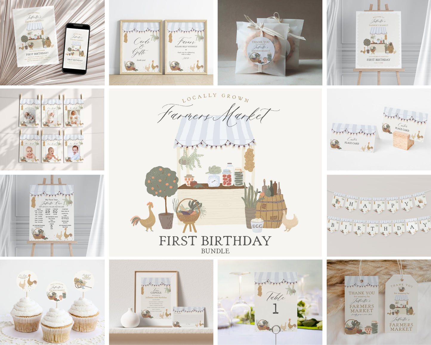 It's a One Day Only, Farmers Market Birthday. Elevate your event with the authentic charm of an outing at your local Farmers Market. This collection features an adorable blue farmers market stand accented with market-fresh treasures. A party brimming with farm-fresh delights and the spirit of community.