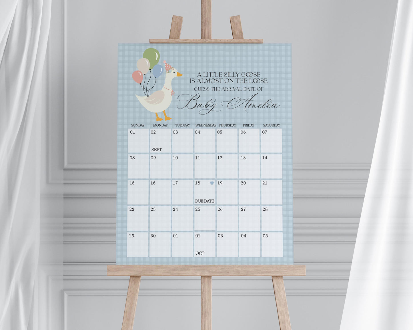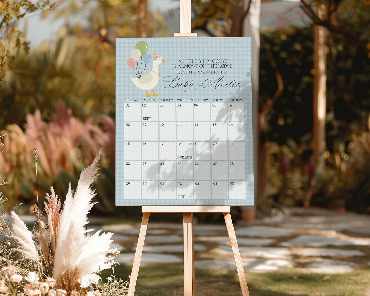 Blue Floral Silly Goose Baby Shower Guess the Date Game Template, Little Duck Theme Shower Girl, Pastel Floral Gingham Baby Sprinkle WP1023