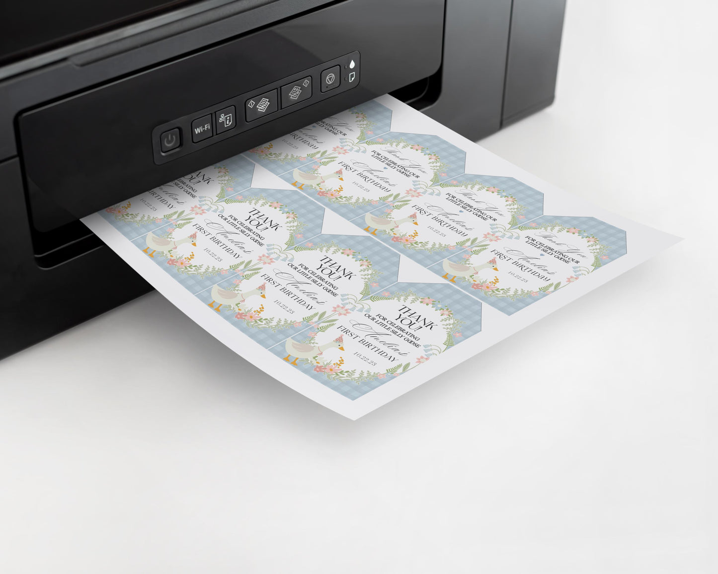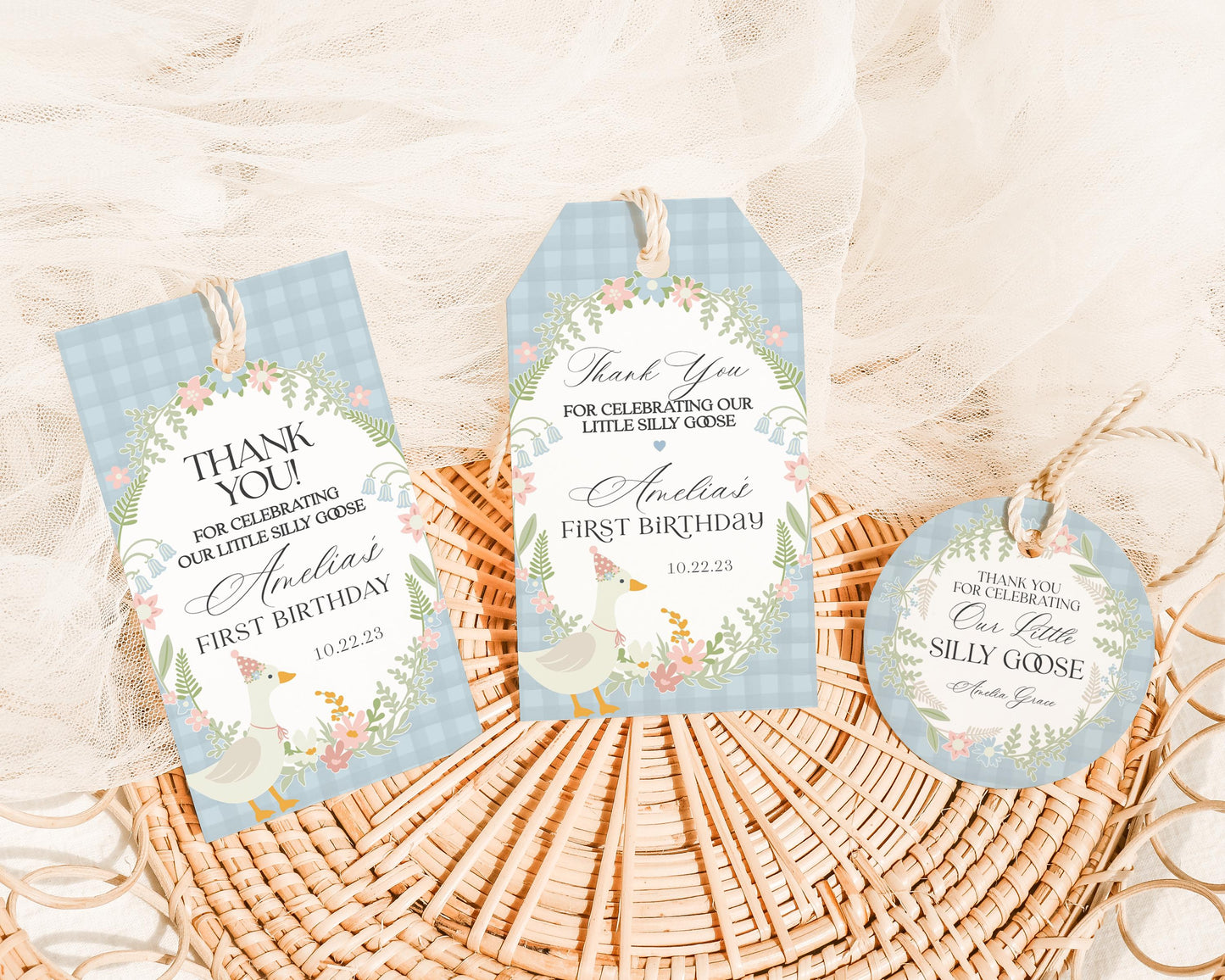 Blue Floral Silly Goose Birthday Favor Tags Printable Template, Little Duck Theme Birthday Girl, Pastel Gingham Birthday Party Decor WP1023