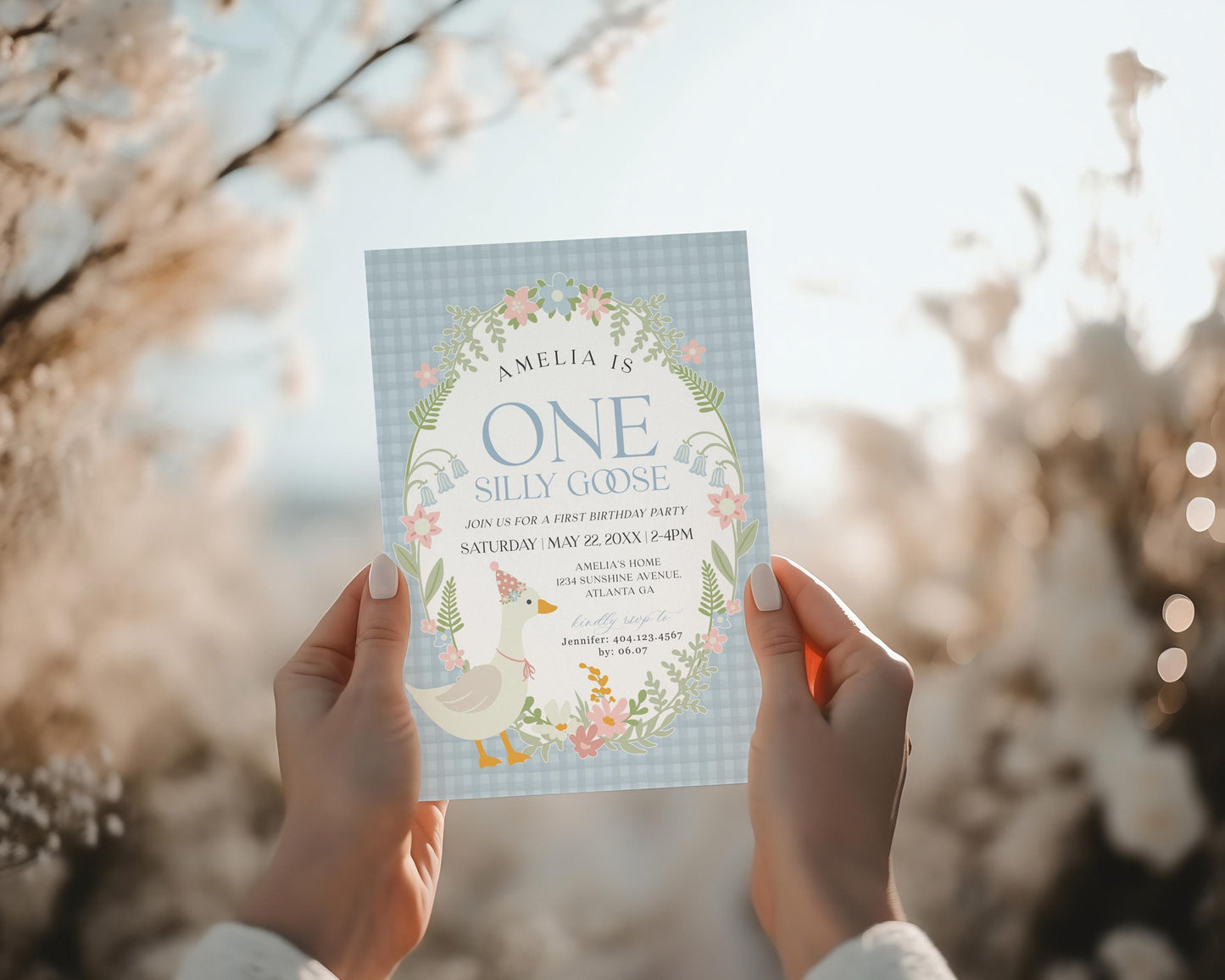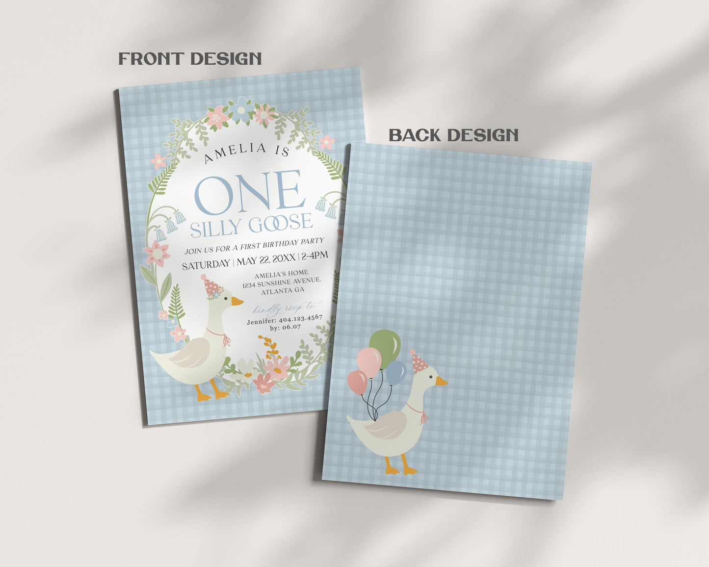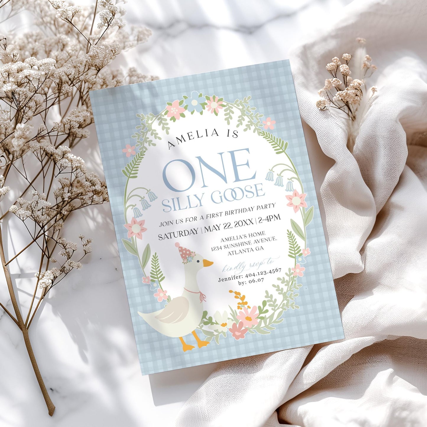Blue Floral Silly Goose First Birthday Invitation Printable Template, Little Duck Theme Birthday Girl, Pastel Floral Gingham Birthday WP1023