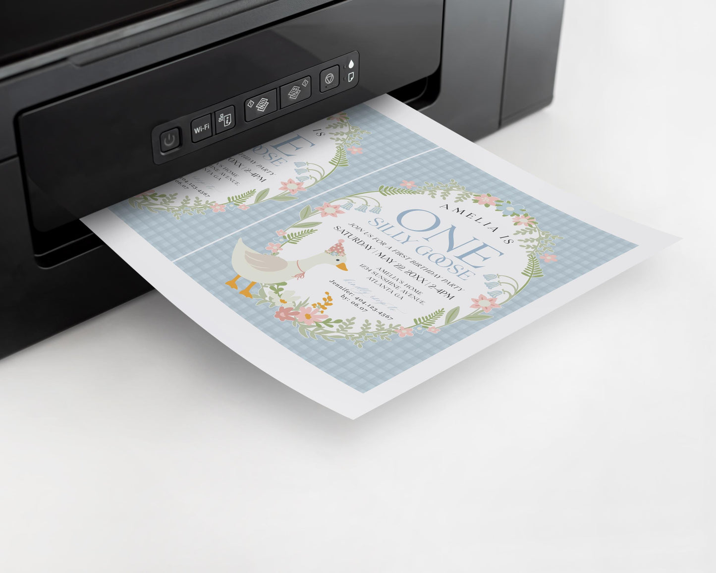 Blue Floral Silly Goose First Birthday Invitation Printable Template