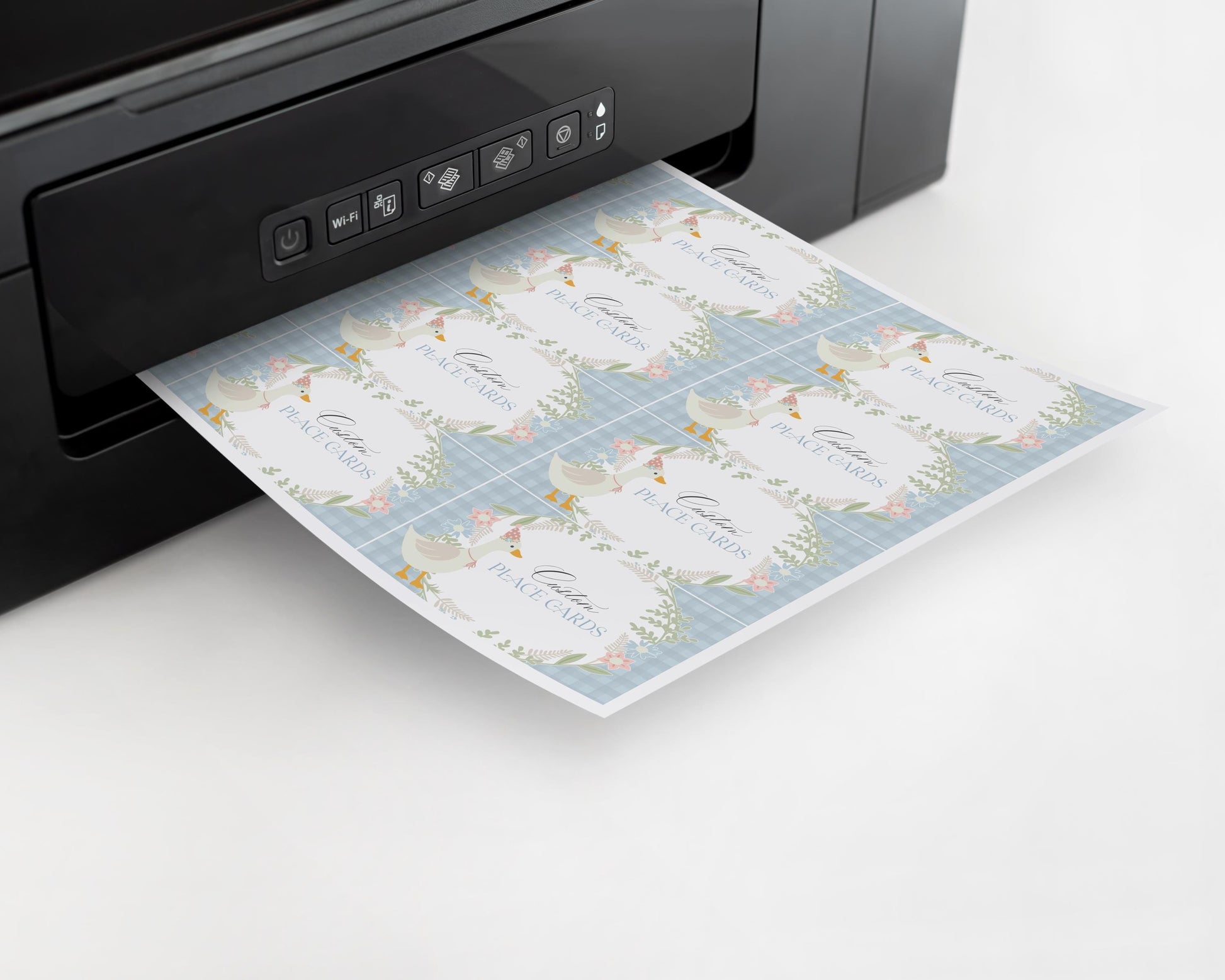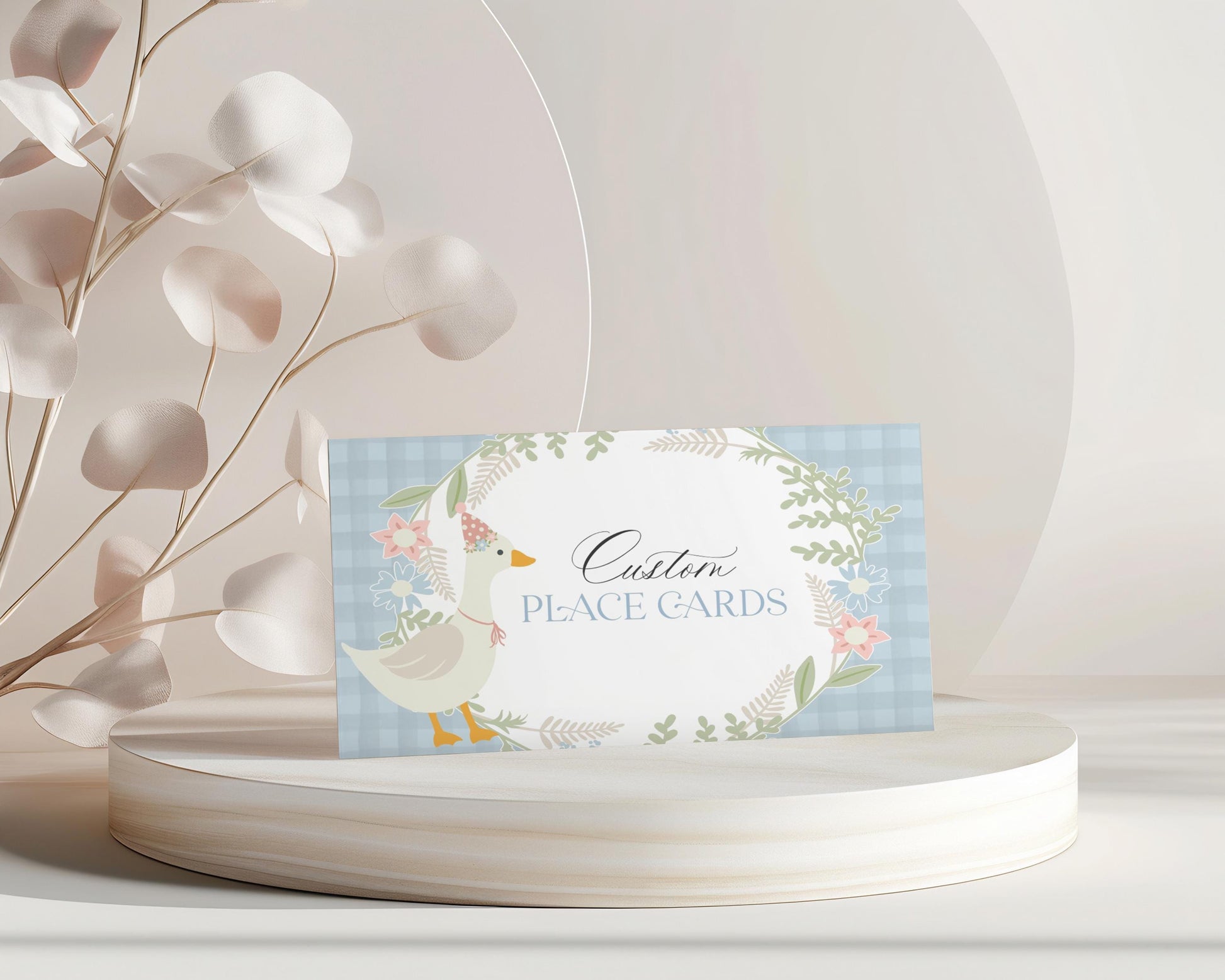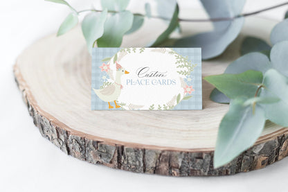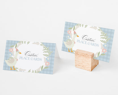 Blue Floral Silly Goose Place Cards Printable Template, Little Duck Theme Girl Birthday Party, Pastel Gingham Baby Shower Sprinkle WP1023